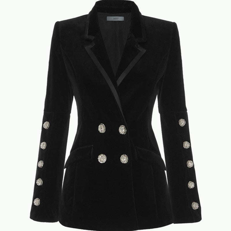 Our spectacular double-breasted Chic Velvet Blazer is made of thick velvet fabric and features a fitted style and sharp shoulders. Peak lapels with satin inserts and rhinestone buttons at the front. back. and sleeves add a touch of elegance and glam to this blazer. This Chic Velvet Blazer will elevate any evening look even if you wear a plain dress. Please check a size chart and size up if you are between sizes.