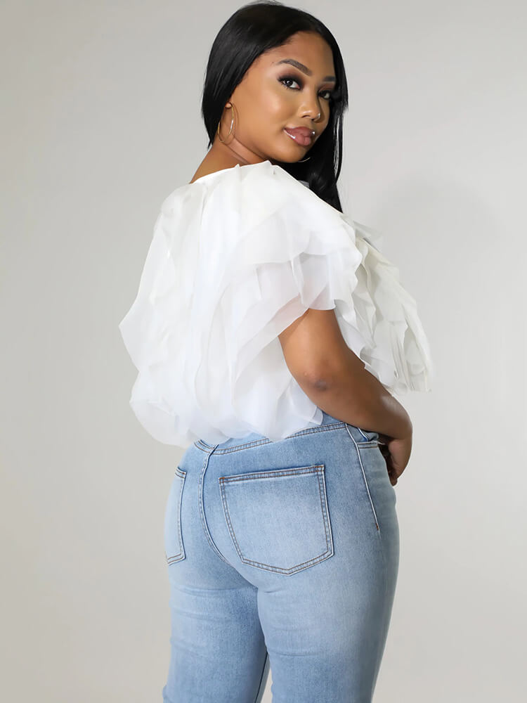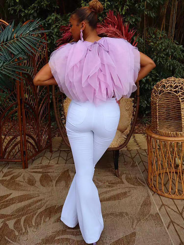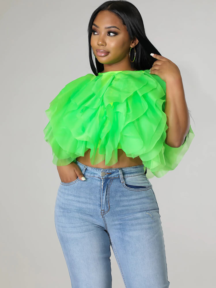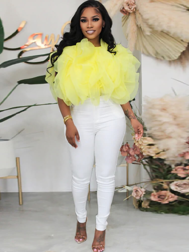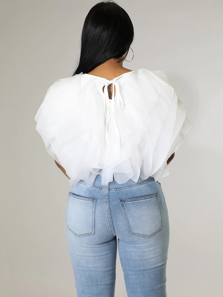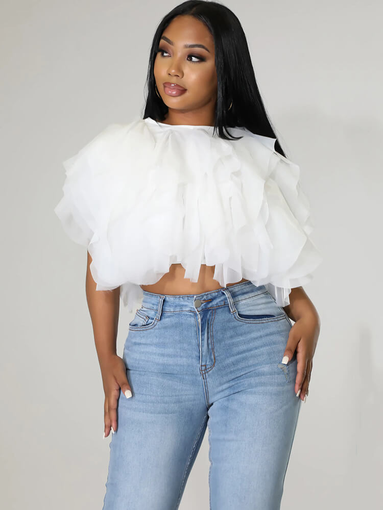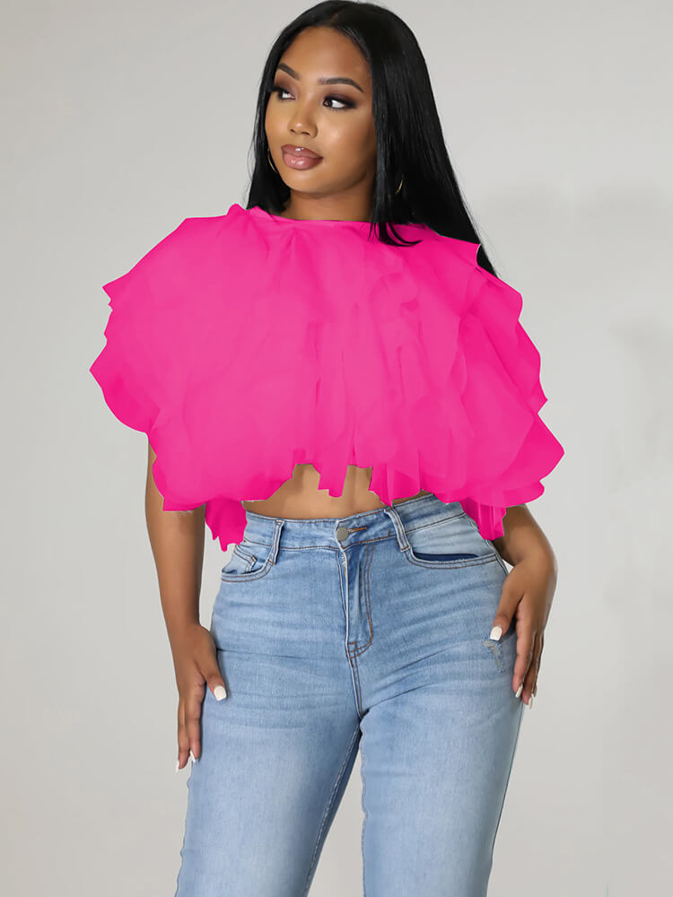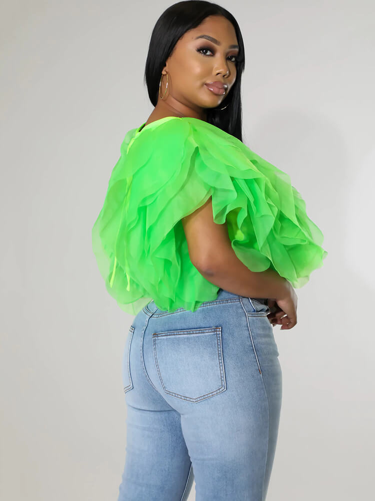Feature: Ruffle sleeve. solid color. stacked. mesh. crop top. casual. lace-up. bodycon. sexy.