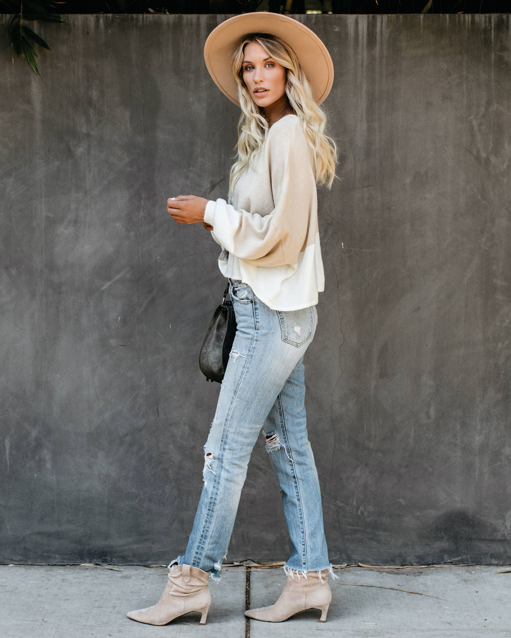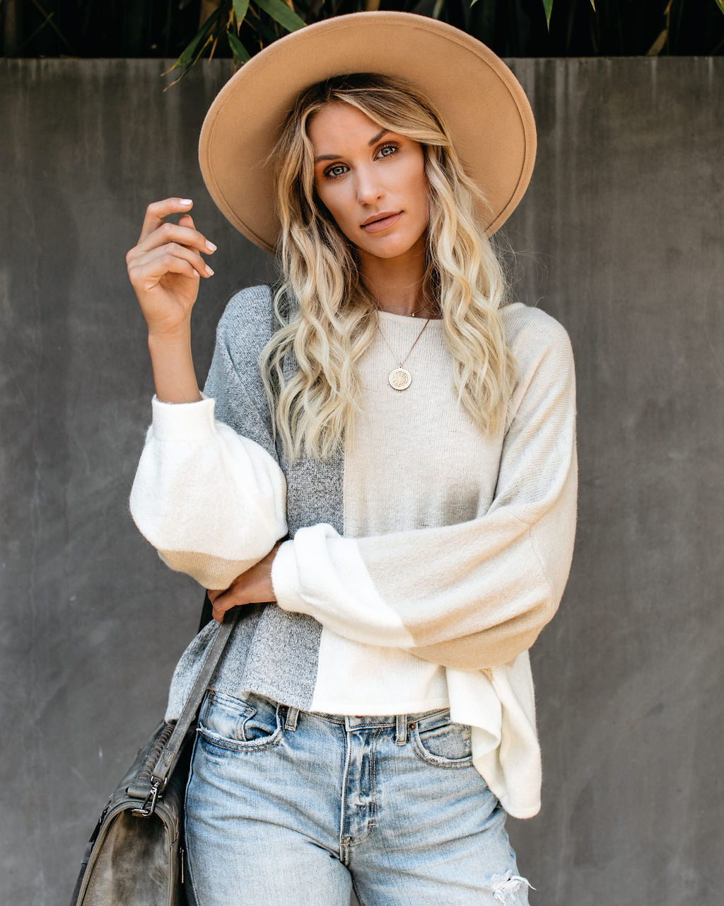 //Best Seller// Is it Fall yet? Our City View Colorblock Balloon Sleeve Sweater is so ready! Featuring a charcoal. white and cream color blocked design on a soft and luxe knit fabrication. The oversized and relaxed fit wears with a wide neckline and dolman style balloon sleeves. A super posh sweater to kick off the cooler season with your favorite denim and booties! Styled with the El Dorado Hat. Chloe Mini Necklace. The Buddha Wheel Necklace. One Thing Right High Rise Distressed Denim. Marant Faux Suede Heeled Scrunch Bootie and Highland Bag.