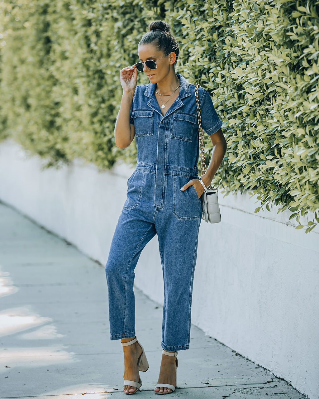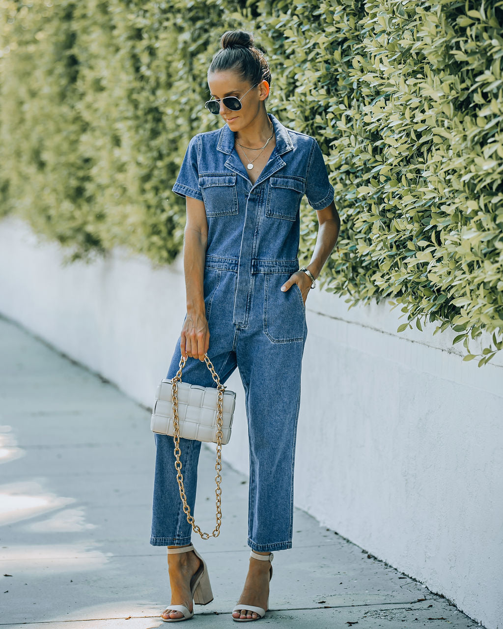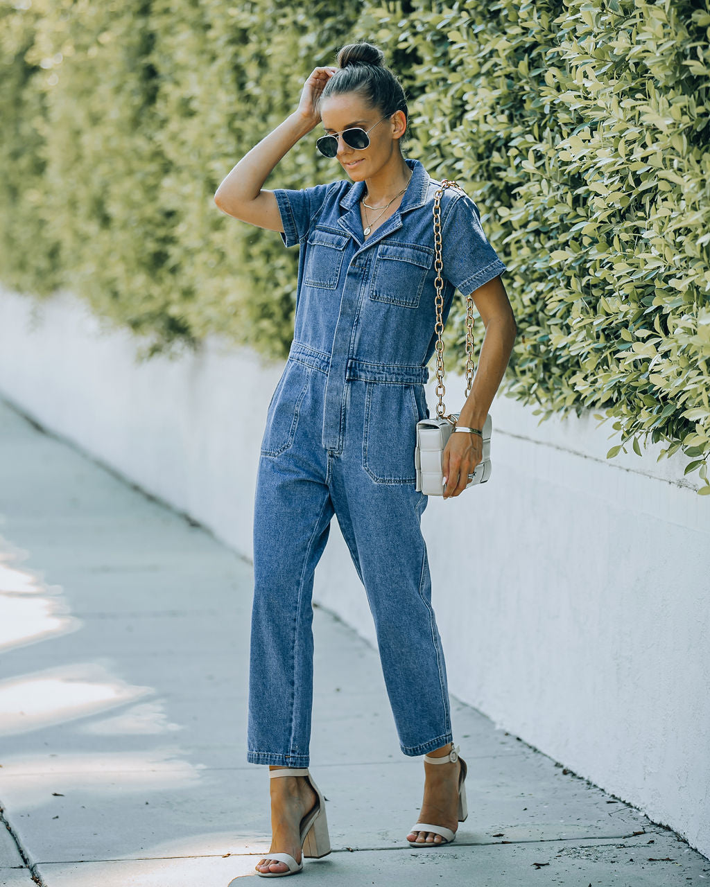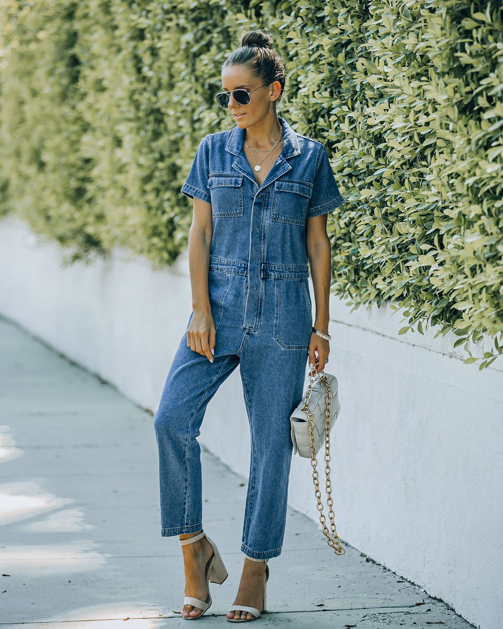 Utility style jumpsuits are the ultimate girl on the go look! Our Claude Pocketed Denim Jumpsuit comes in a dark wash denim. Designed with front button closures and a collar. Finished with side and back pockets. Styled with the Minimal Herringbone Necklace. Compass Coin Necklace. Simple Bangle Bracelet. Desire Padded Woven Chain Handbag. and Formal Faux Suede Heel.