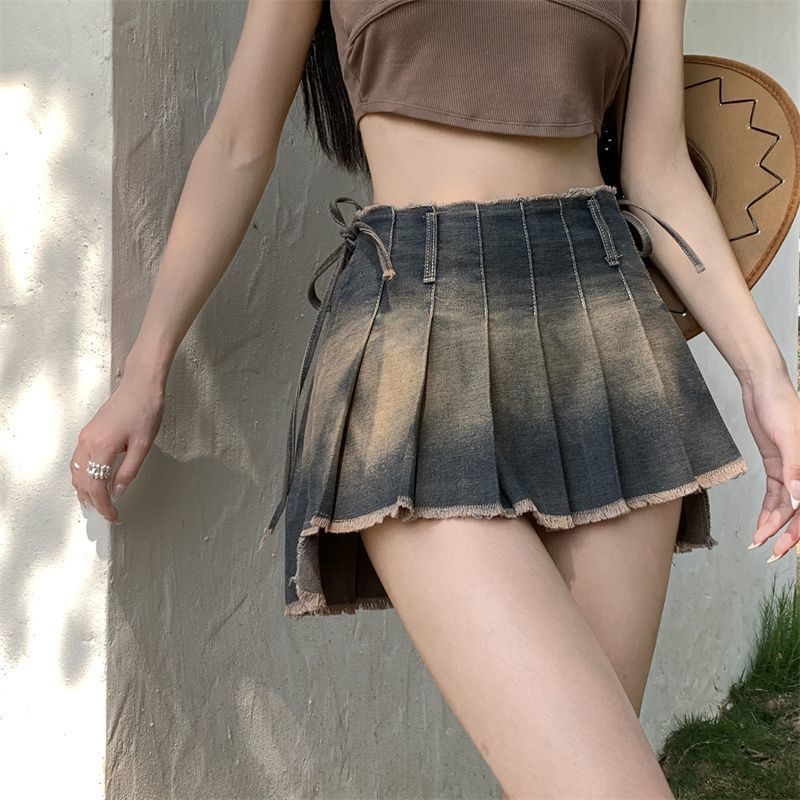 Introducing our 2023 Spring-Summer Collection's sanded. y2k-inspired. pleated. lower-rise denim skirt a dazzling homage to the millennium's iconic fashion!