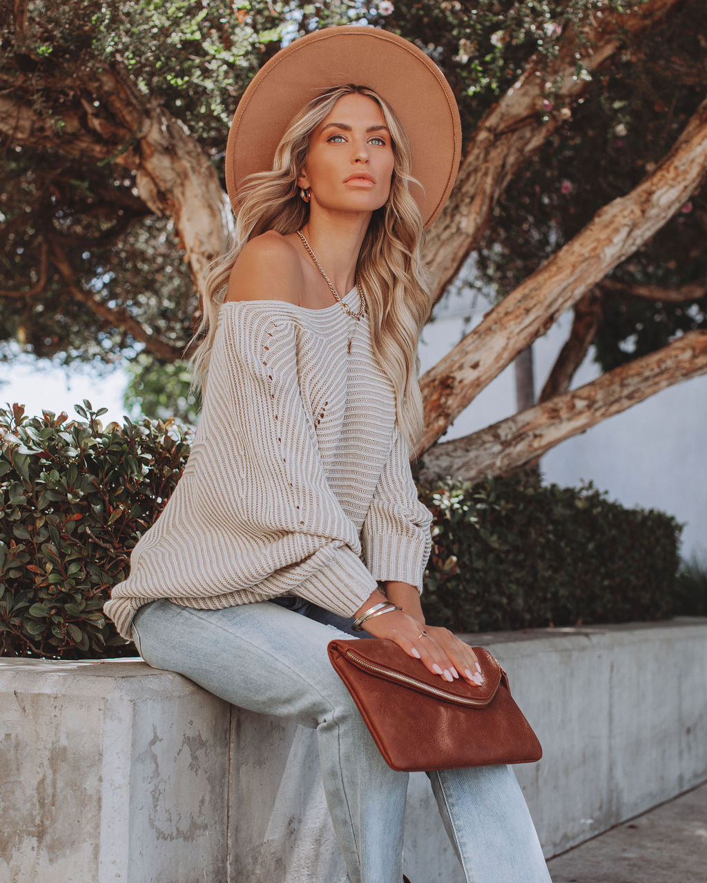 Your new fav everyday sweater! Our Corvallis Dolman Knit Sweater comes in a cream and grey two-tone style. Designed with a wide neckline and dolman sleeves. This sweater pairs best with distressed denim! Styled with the Rocky Mountain Hat. Mercury Hoops. Bing Layered Chain Necklace. Stella Crossbody Envelope Zip Clutch. Mcguire High Rise Distressed Denim. and Jocelyn Heeled Bootie.