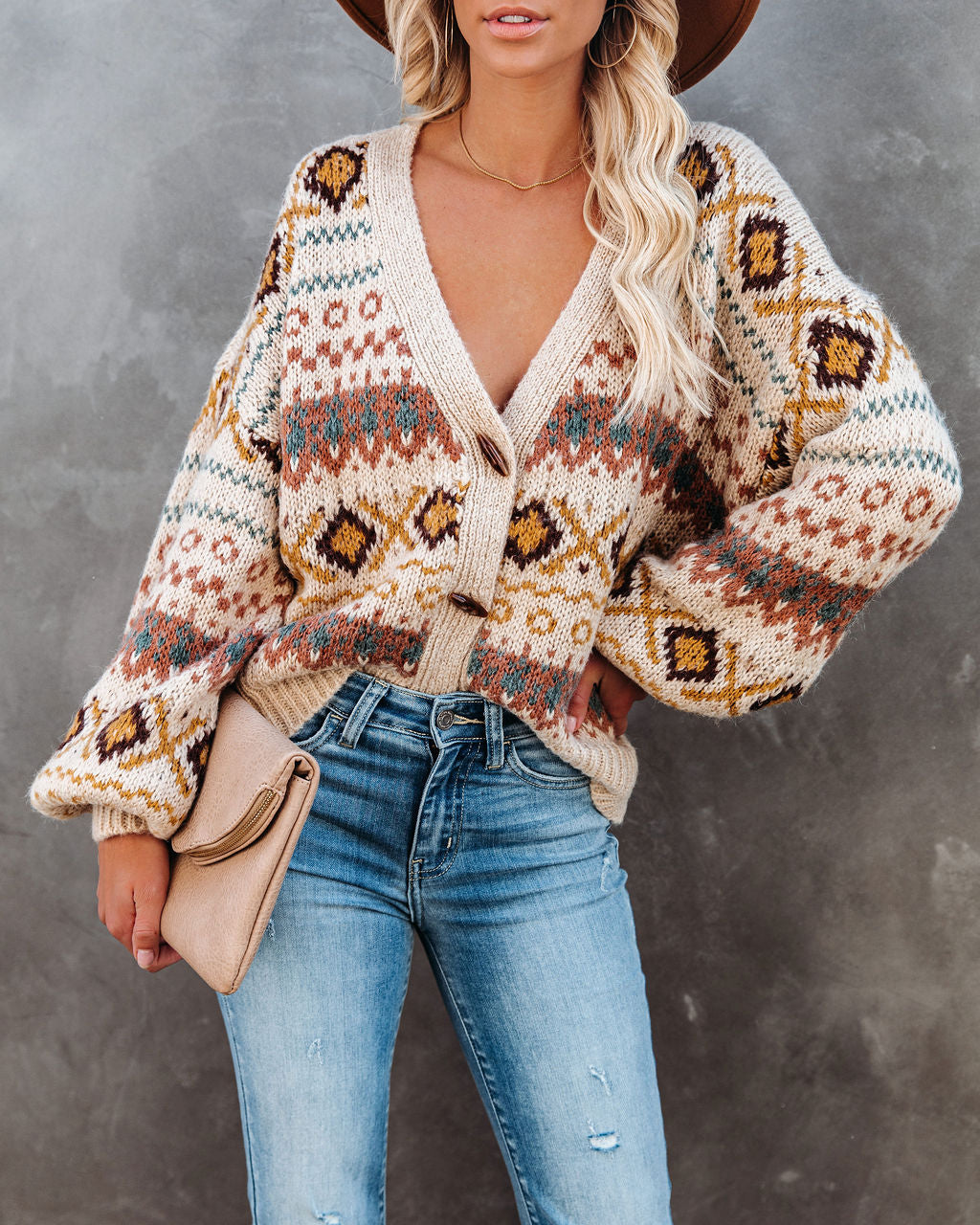 We adore the Country Cottage Button Front Relaxed Cardigan for its relaxed fit and thick knit fabrication. This best selling silhouette is crafted in a cream base with a geometric pattern in hues of mauve. dusty blue. plum and mustard! Designed with long sleeves and front button closures. Pair the plunging neckline with a bralette underneath for added coverage.Styled with the El Dorado Hat. Perfect Hoop Earrings. Uncomplicated Chain Necklace. Stella Crossbody Envelope Zip Clutch. McGuire High Rise Distressed Denim. and Culture Faux Leather Heeled Bootie.
