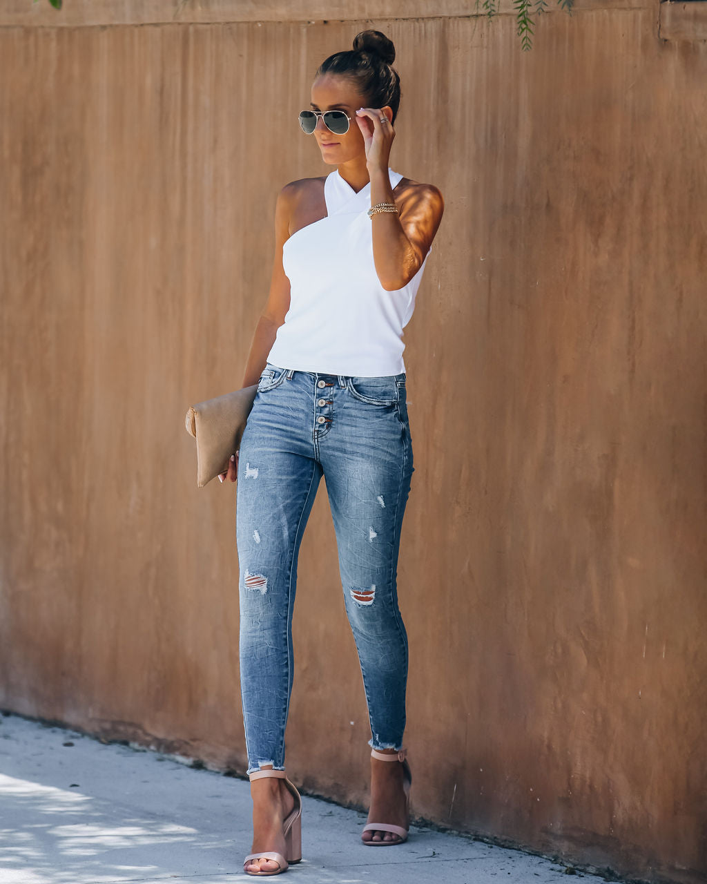 //Best Seller// This top is the one! Our Cross Paths Knit Tie Tank is a sassy upgrade to your Summer wardrobe. This stretchy white top fits snugly throughout with a criss cross neckline and open back. A back waist tie holds the look together with alluring appeal! Styled with the Kelsey Chain Bracelet. Suri High Rise Distressed Skinnies. Larkin Heel and the Stella Crossbody Envelope Zip Clutch.