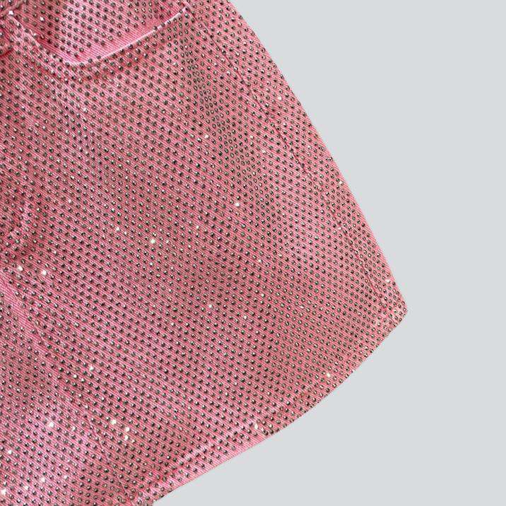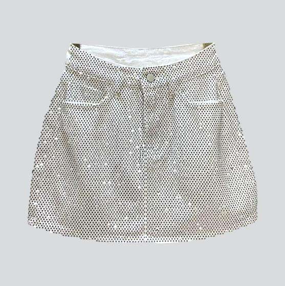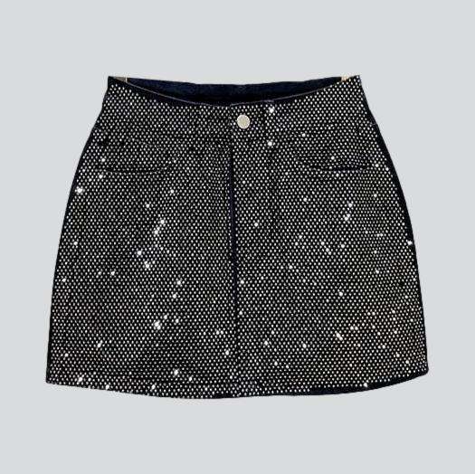 Introducing the 2023 Summer Collection a dazzling crystal-embellished mini denim skirt. a luxe throwback to the Y2K era with a modern twist!