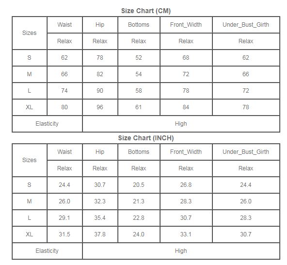 | Sizes | Waist | Hip | Bottoms | Front_Width | Under_Bust_Girth |