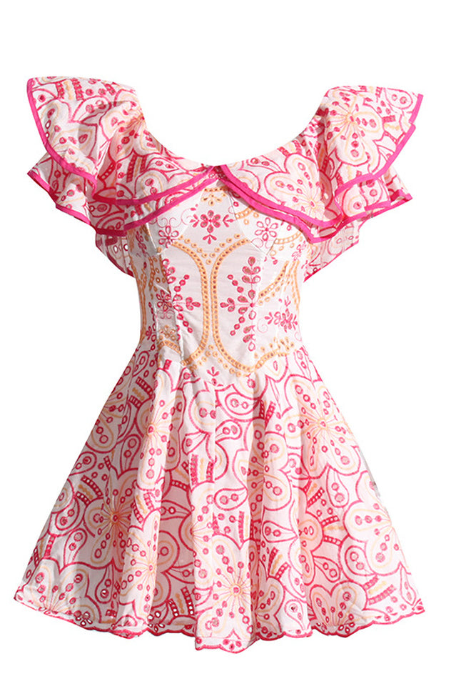 Made of broderie anglaise cotton-blend. our Dalia skater dress showcases your feminine figure thanks to the beautiful Bardot neckline. flared skater skirt and fluttery ruffled sleeves. The slim fitted corset bodice is incredibly flattering. Style yours with neutral accessories and a loose updo to flaunt your sunkissed décolletage.