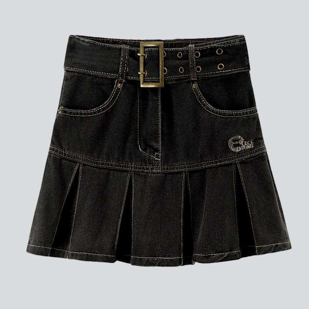 Flaunt your unique style with this Denim Skater Skirt from the 2023 Summer Collection! This y2k-style above-the-knee skirt features an stitched waistline. mid-waist fit. zipper and button closure. making it both unfussy and stylish. Perfect for making a statement. this skirt will have you ready to steal the spotlight!Distinctive Features: