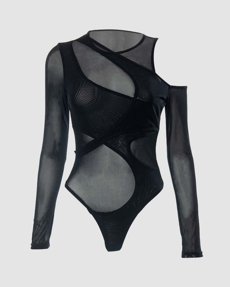 Details: Long-sleeve bodysuit with mesh design and cut out details