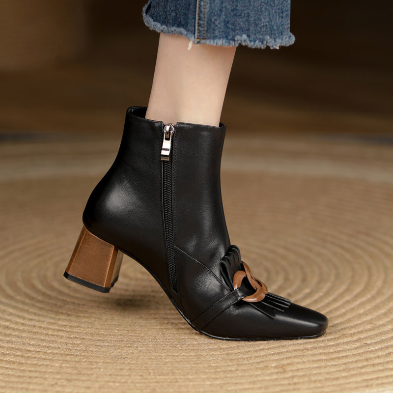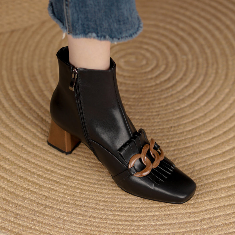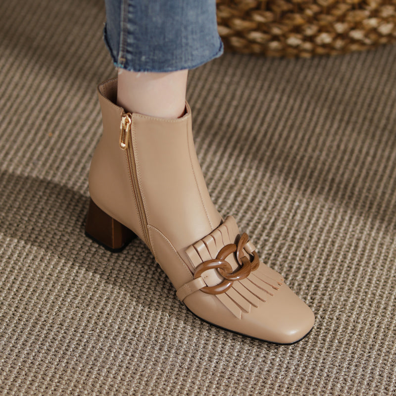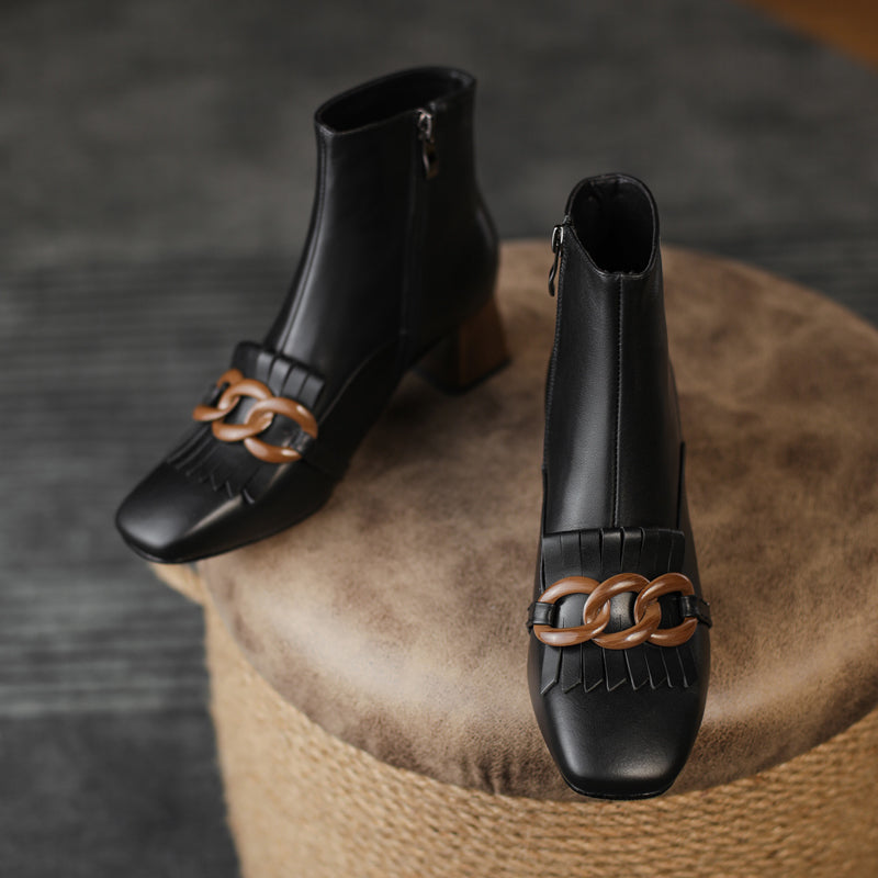 Decorated with chain and tassel. designed with a square toe and low block heels. these ankle boots offer you a retro touch. Handmade with premium cow leather. they upgrade your whole style to the next level. What a bargain to get such good boots for this price.