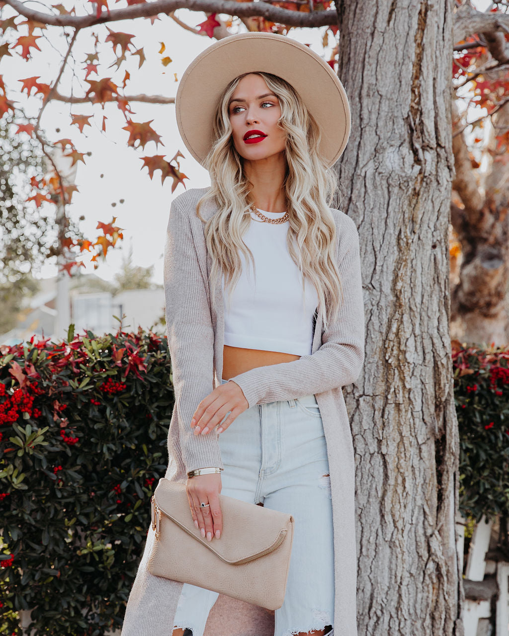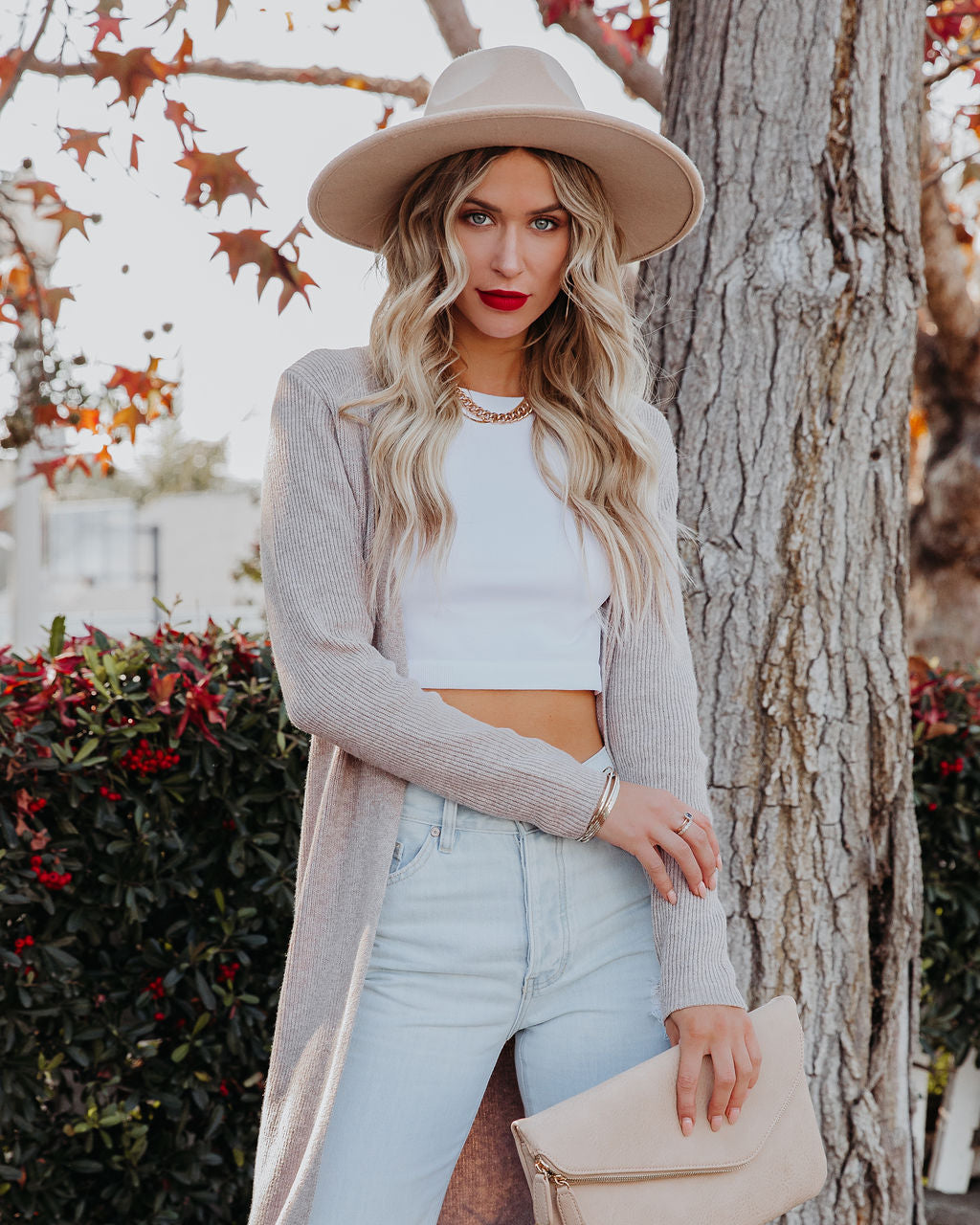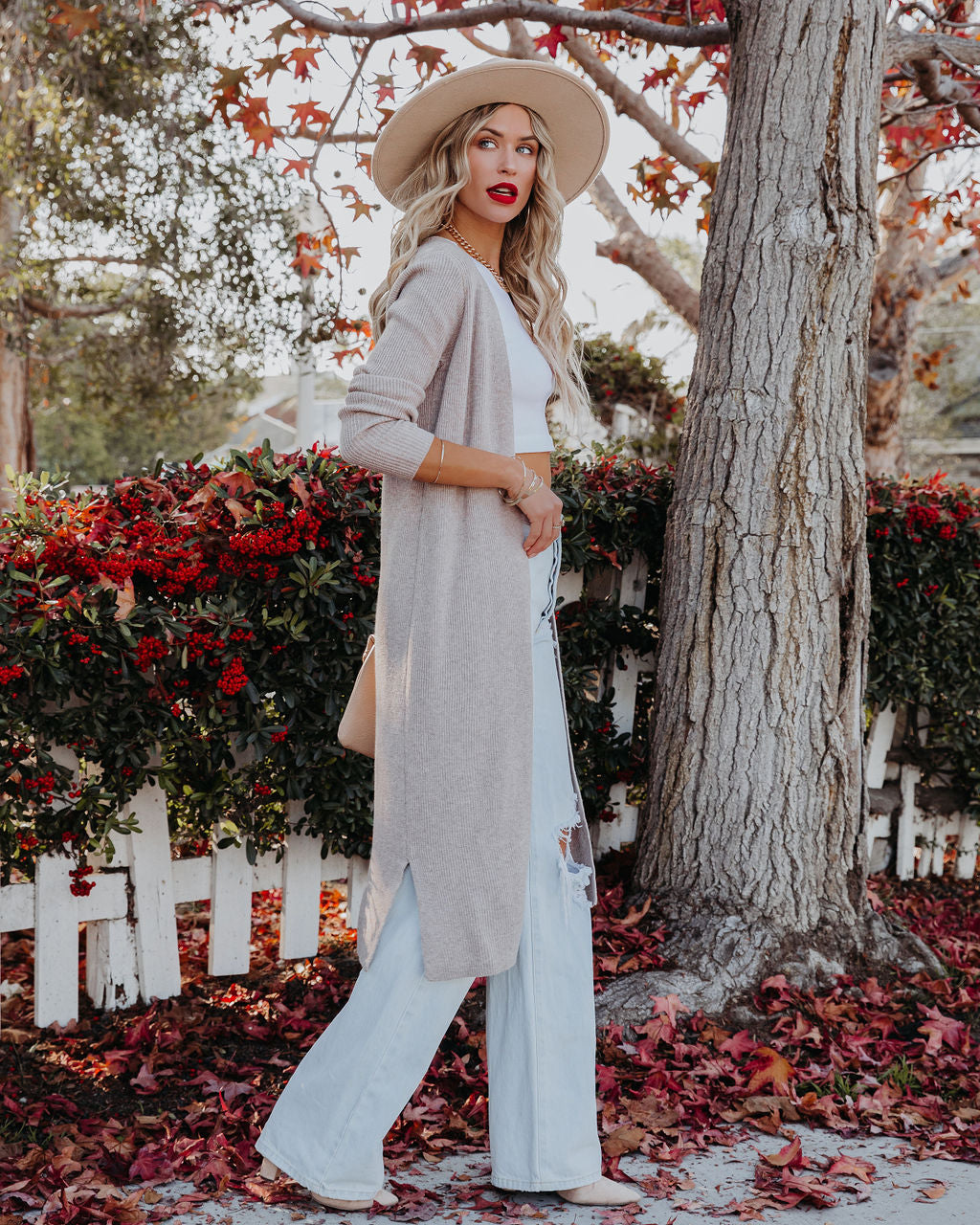 //INSSTREET// For when you need that extra layer of warmth! Our Erie Knit Duster Cardigan comes in a classic taupe hue. Designed with side slits and an open front. Styled with the El Dorado Hat. Perfect Hoop Earrings. Mica Chain Choker. Minimal Herringbone Necklace. Simple Bangle Bracelet. Stella Crossbody Envelope Zip Clutch. Kiki Knit Crop Top. London High Rise 90's Flare Denim. and Ritz Faux Suede Pointed Heel.