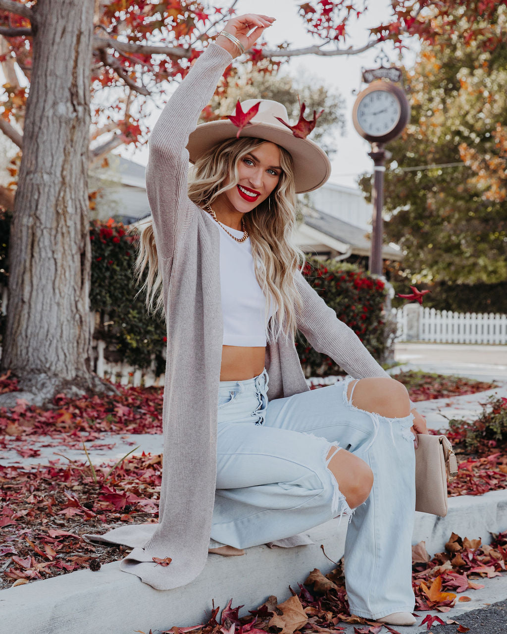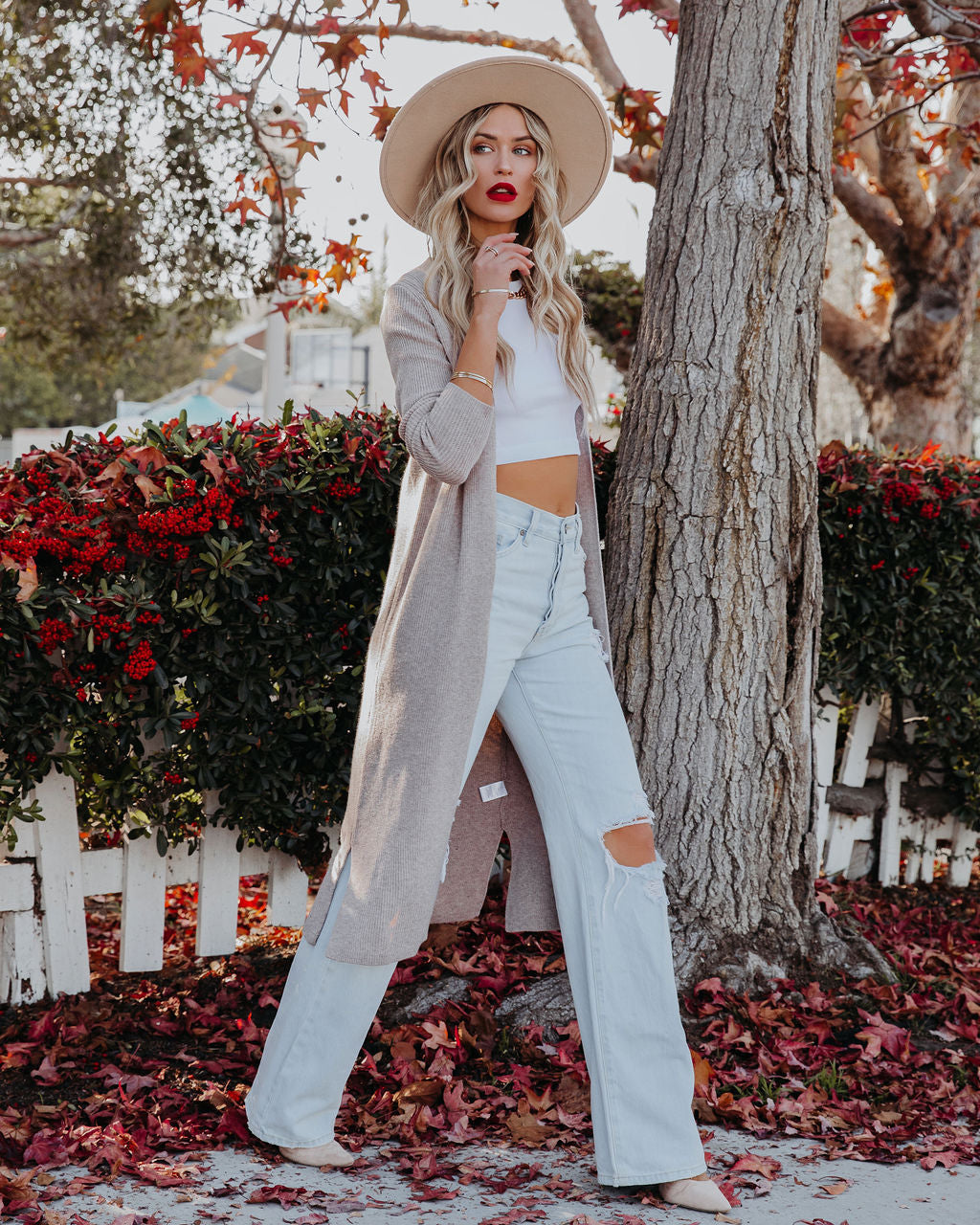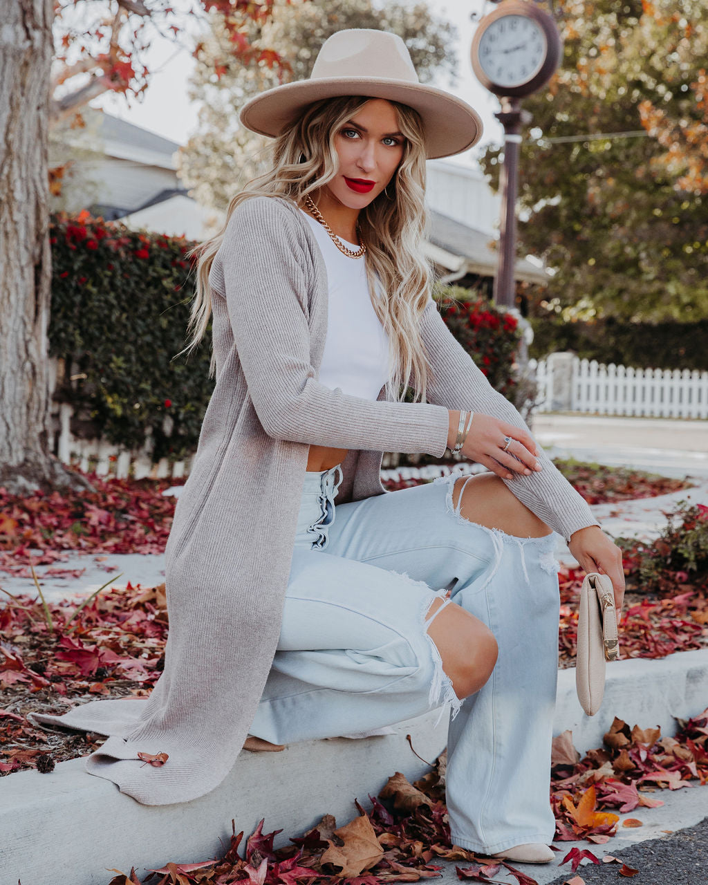 //INSSTREET// For when you need that extra layer of warmth! Our Erie Knit Duster Cardigan comes in a classic taupe hue. Designed with side slits and an open front. Styled with the El Dorado Hat. Perfect Hoop Earrings. Mica Chain Choker. Minimal Herringbone Necklace. Simple Bangle Bracelet. Stella Crossbody Envelope Zip Clutch. Kiki Knit Crop Top. London High Rise 90's Flare Denim. and Ritz Faux Suede Pointed Heel.