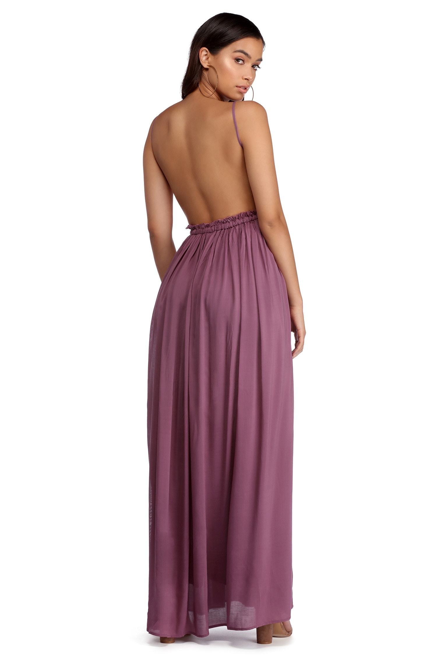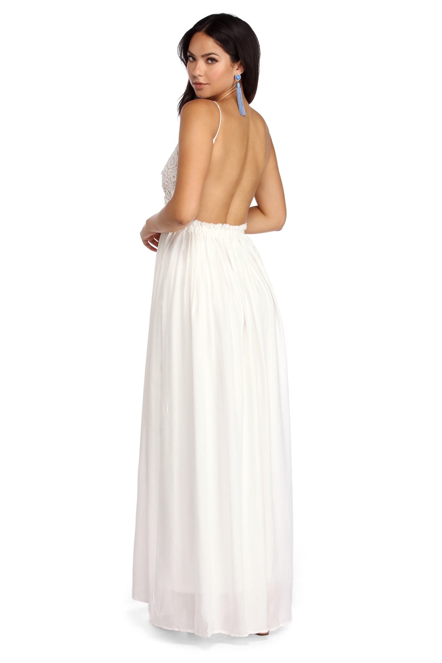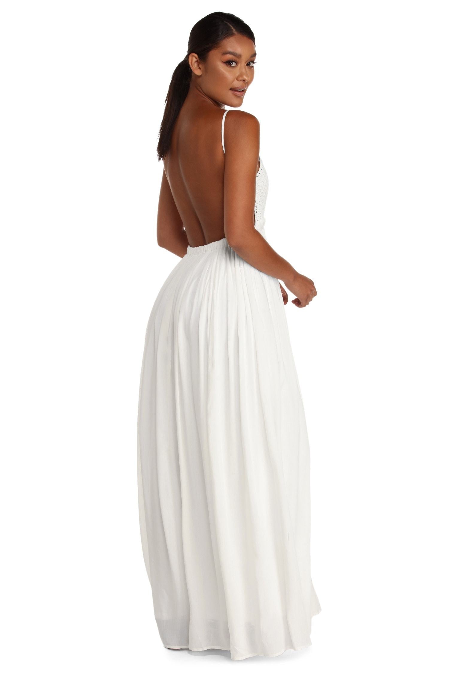 Be that trendy social butterfly at your next daytime event in this ethereal maxi dress! This backless trendsetter will be all the rage with a crochet bodice. adjustable narrow strap. and an elastic empire waist. Maxi skirt is a flowy A-line silhouette composed of a lightweight crinkled fabric. Dress is fully lined and offers minimal stretch.