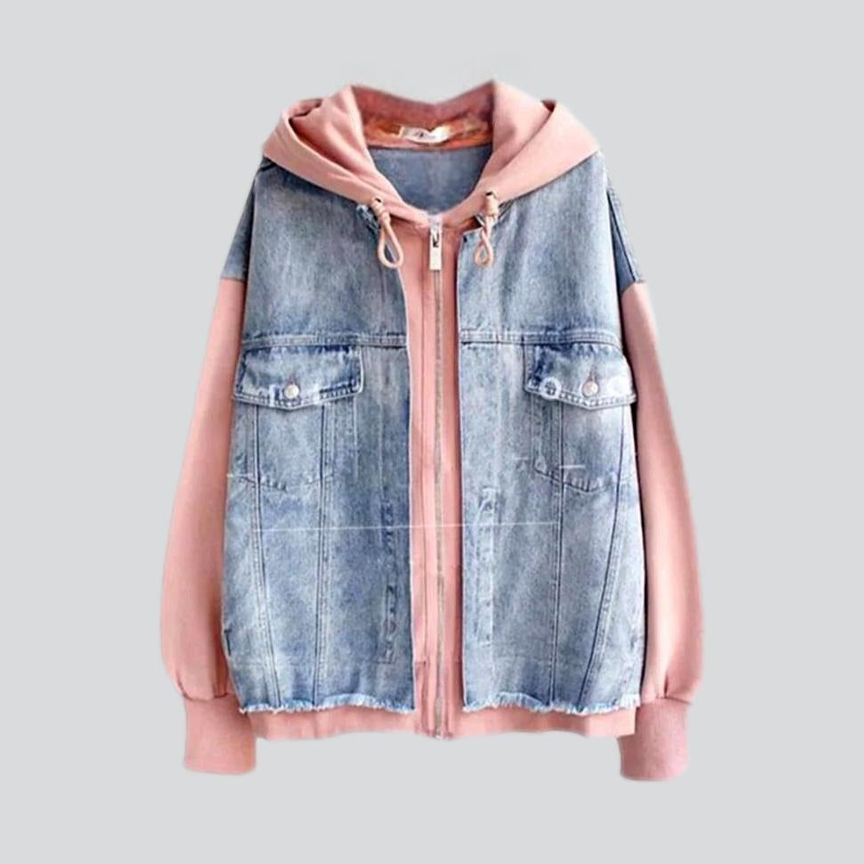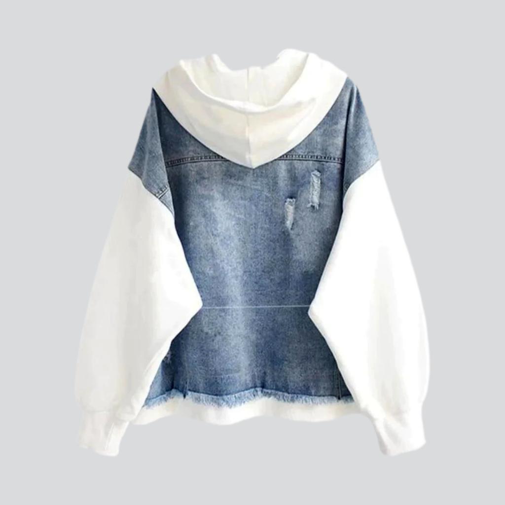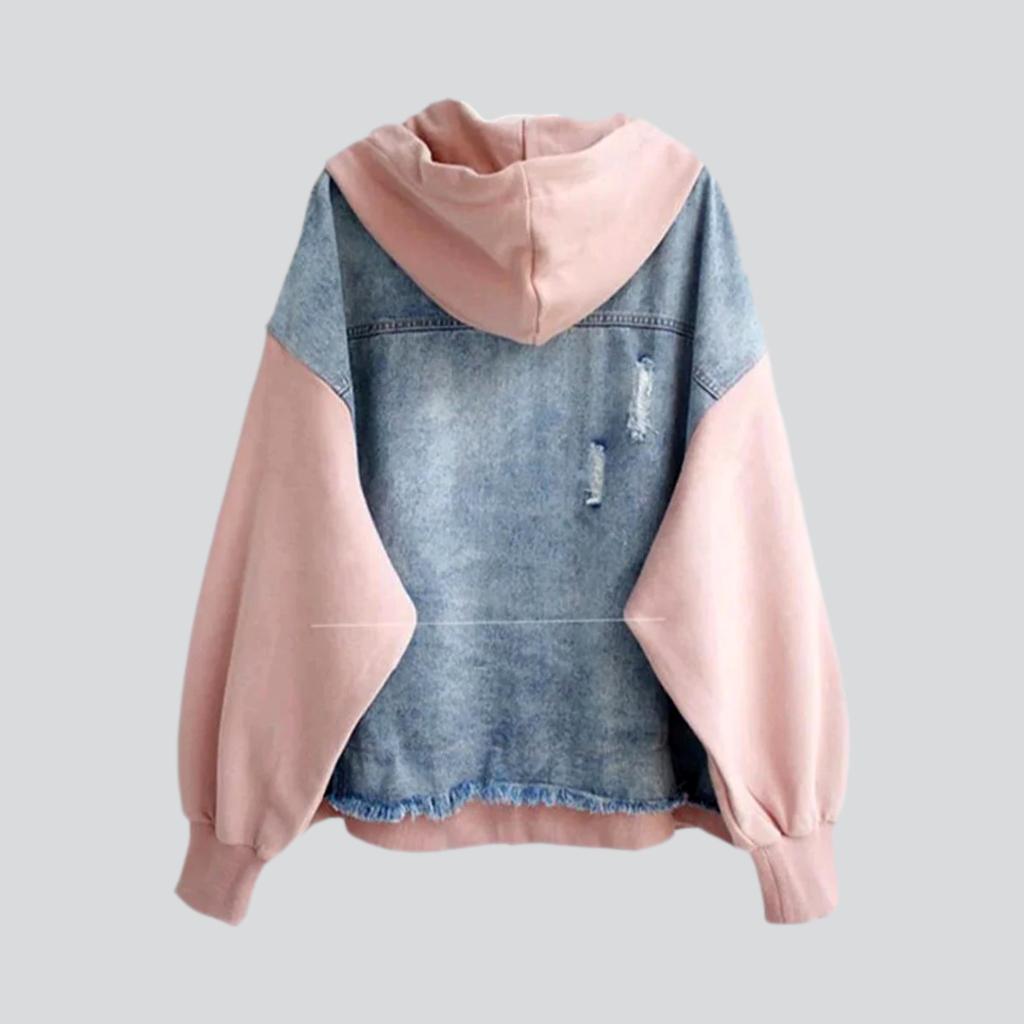 This denim jacket is designed with a timeless silhouette. allowing you to stand out with a fashion-forward look. Crafted with mixed fabrics for comfort. the oversized fit ensures you stay comfortable and stylish. The hooded feature adds a playful touch. while the classic zipper closure makes it easy to slip on and off.