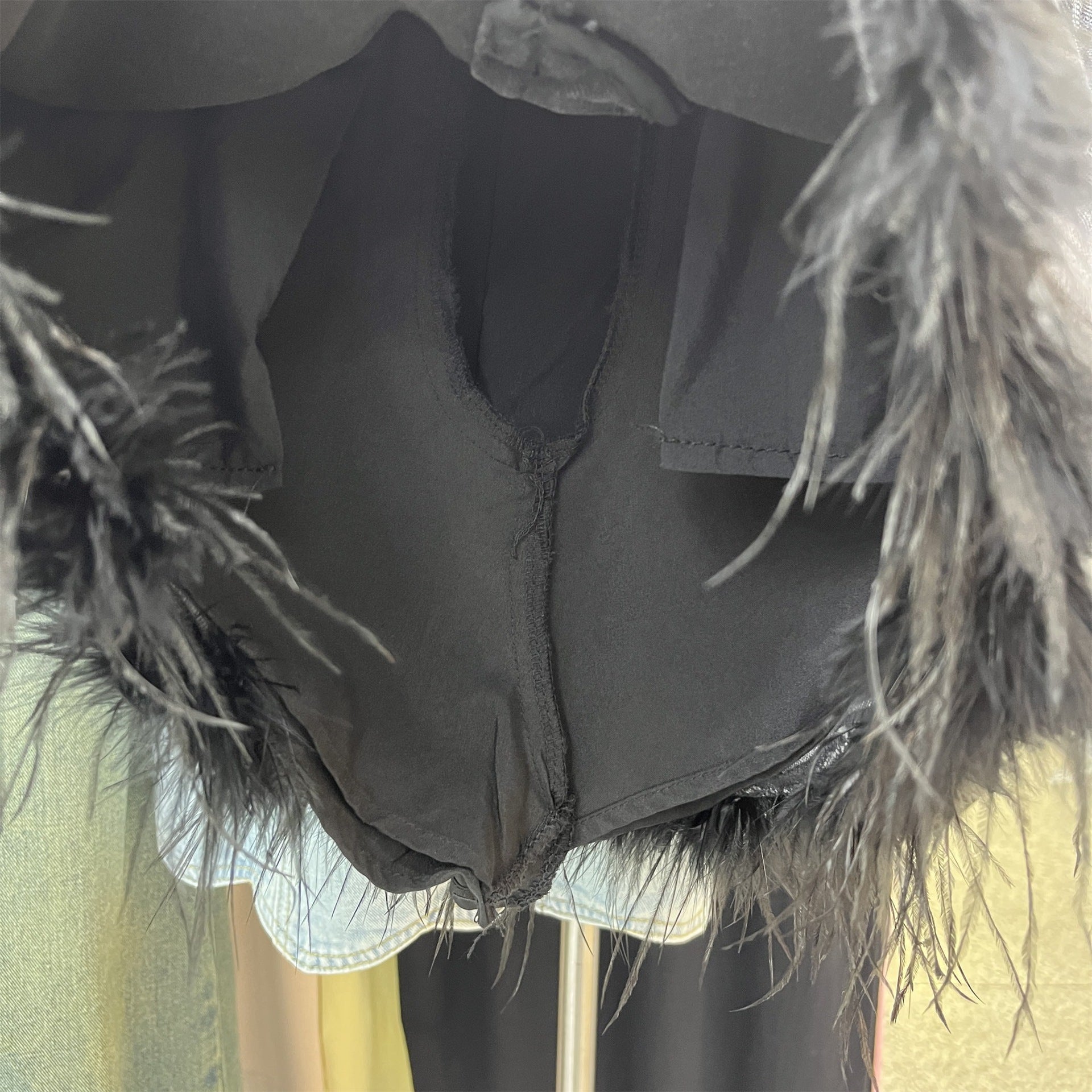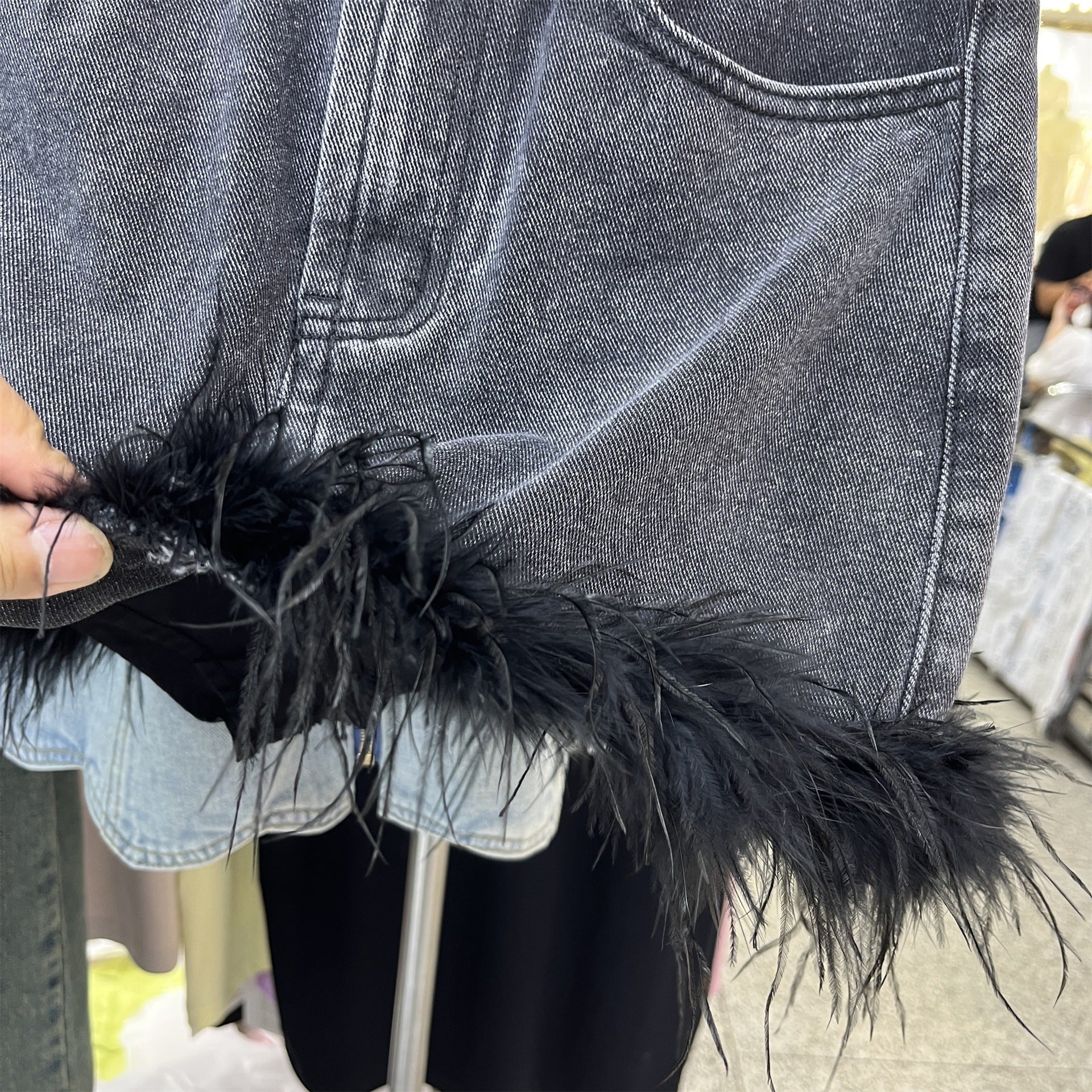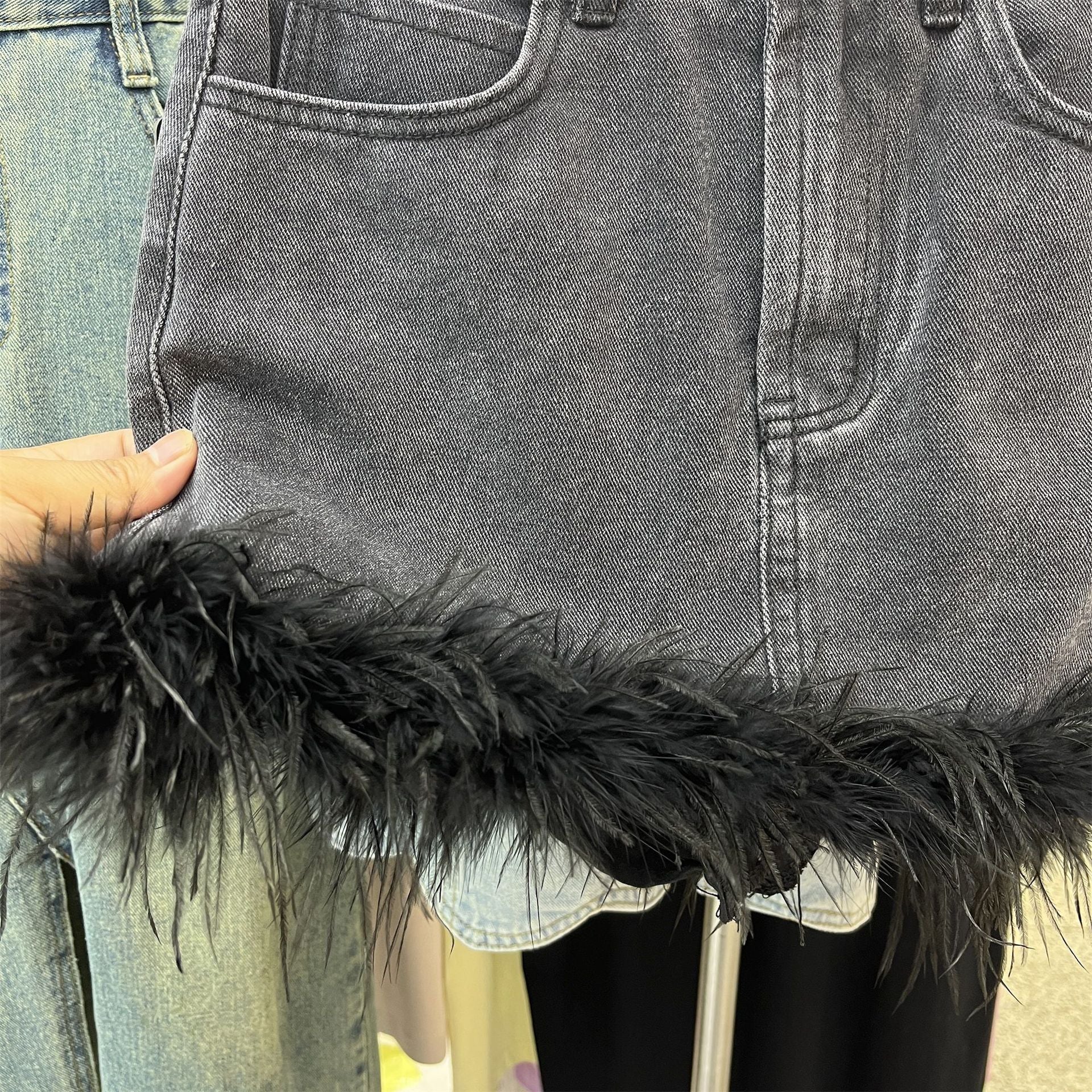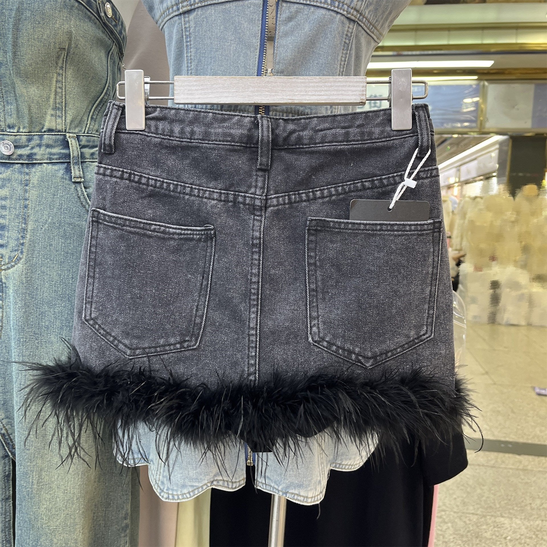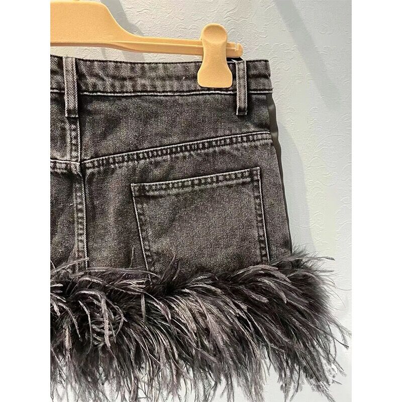Introducing the 2023 Spring-Summer Collection's feather-trimmed mini denim skirt. a vintage-style masterpiece perfect for the modern fashionista!