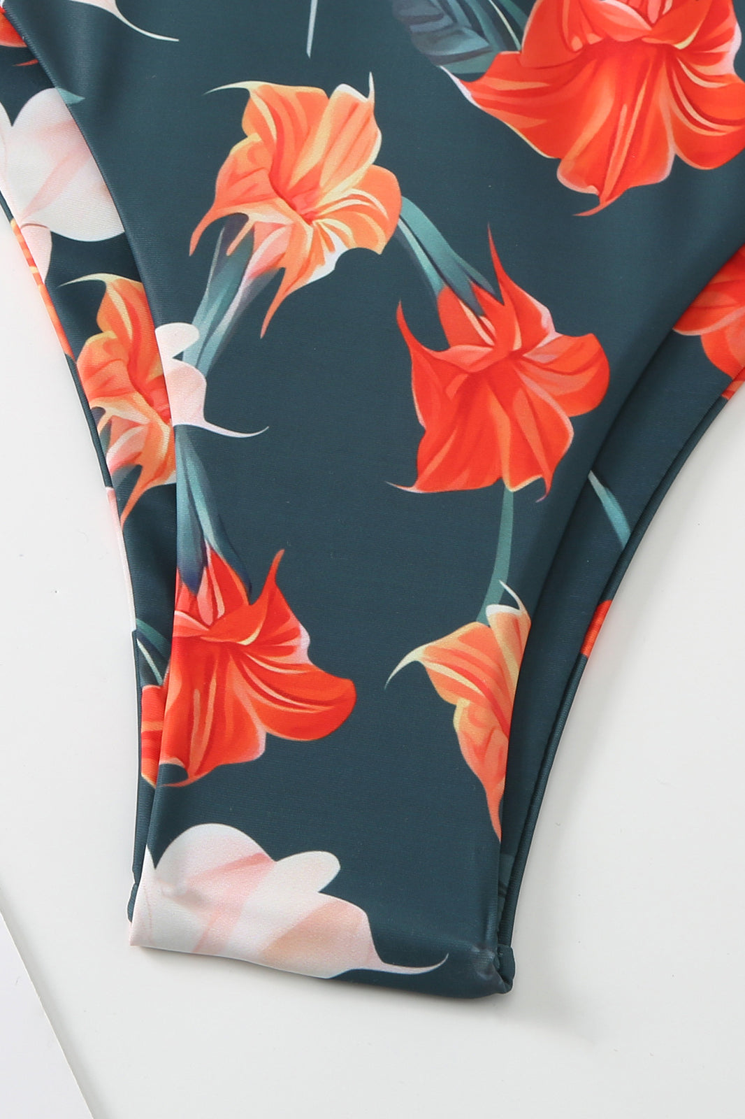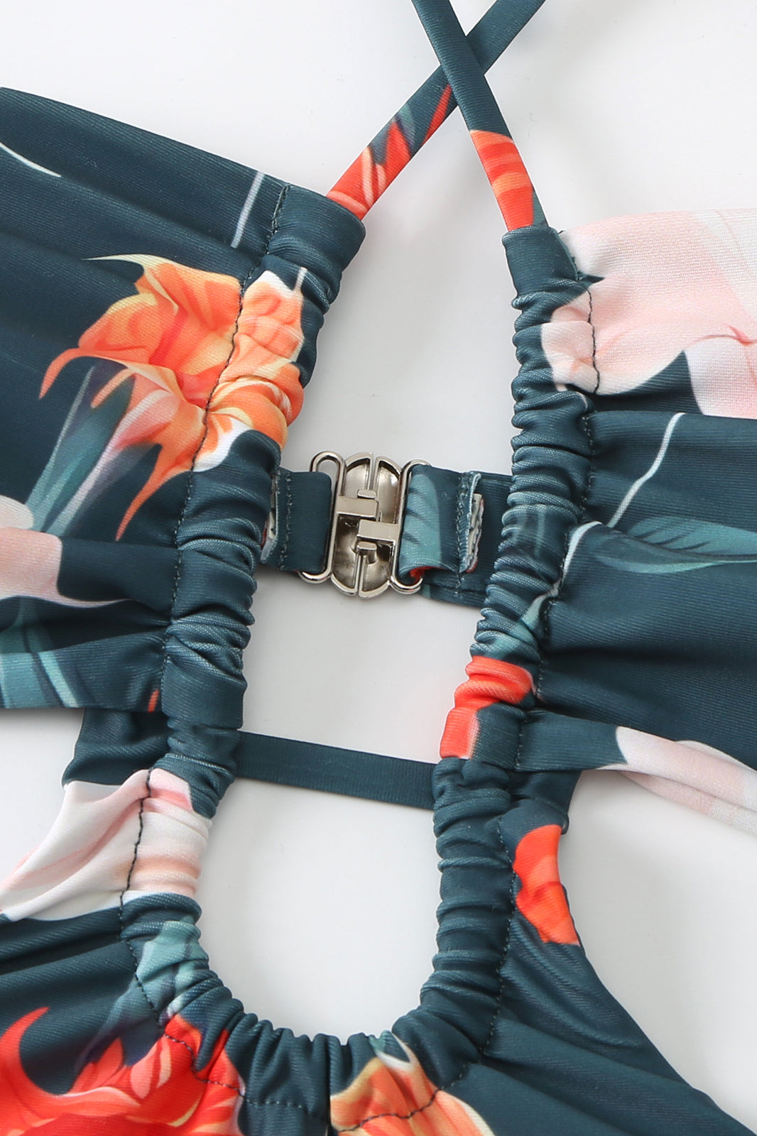 Floral Printed Cutouts Halter One Piece Swimsuit - Red