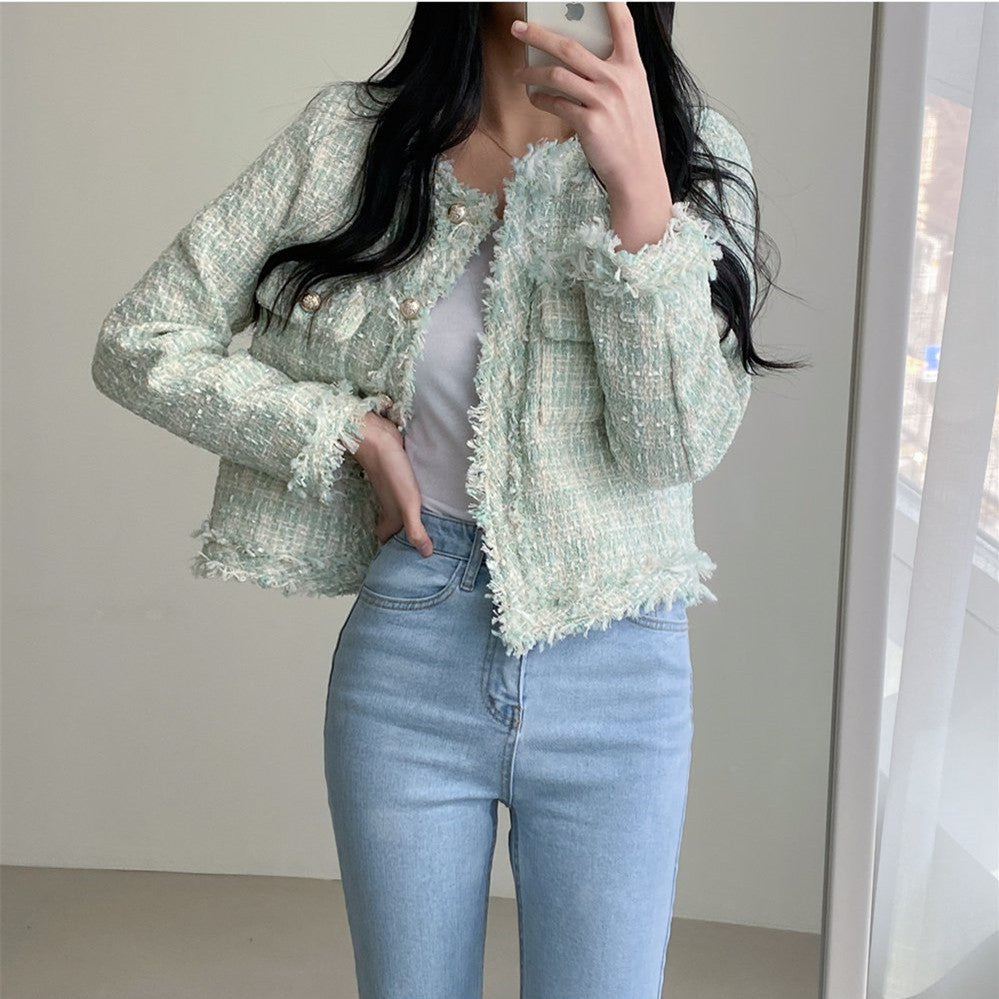 The slim-fit design ensures a flattering fit. while the open front and frayed edges add a touch of modern style.