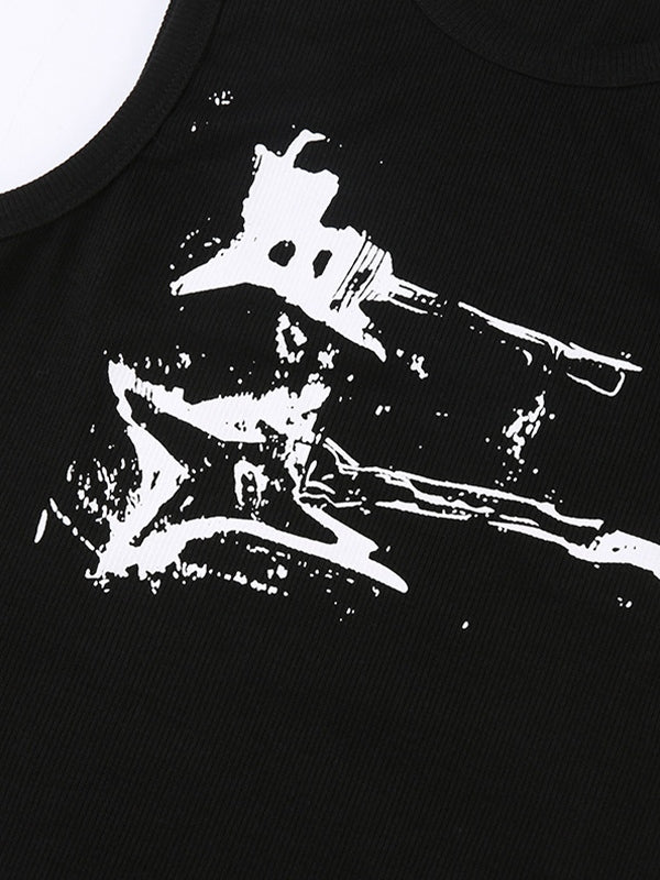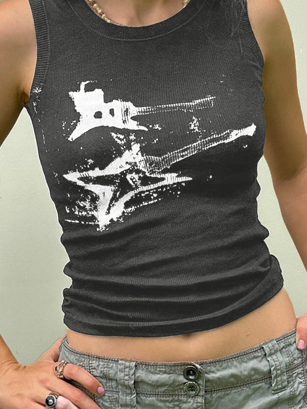 Description: These y2k-inspired tank tops for girls are made from stretch ribbed fabric. features a skin-tightened silhouette. and with grungy guitar pattern print design.
