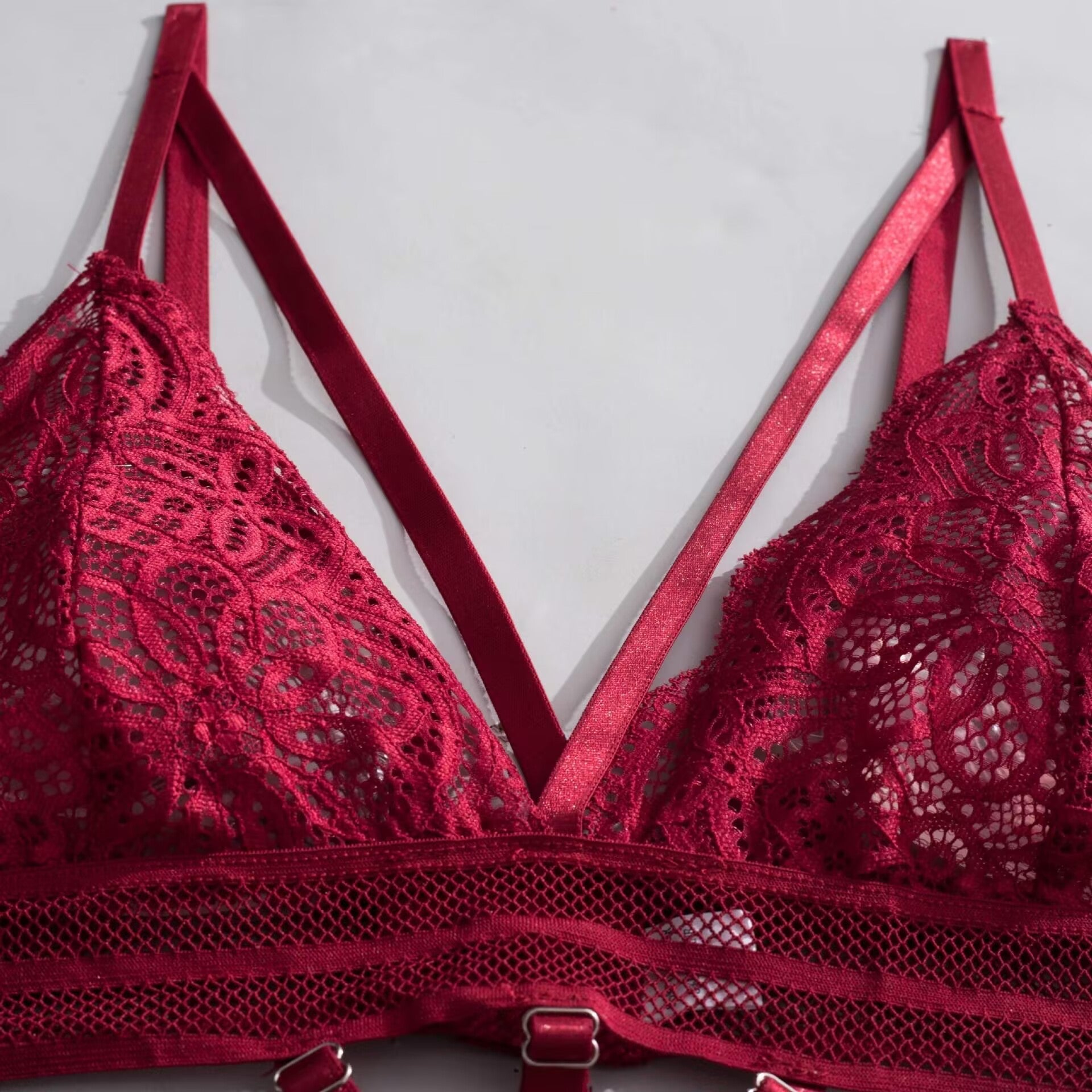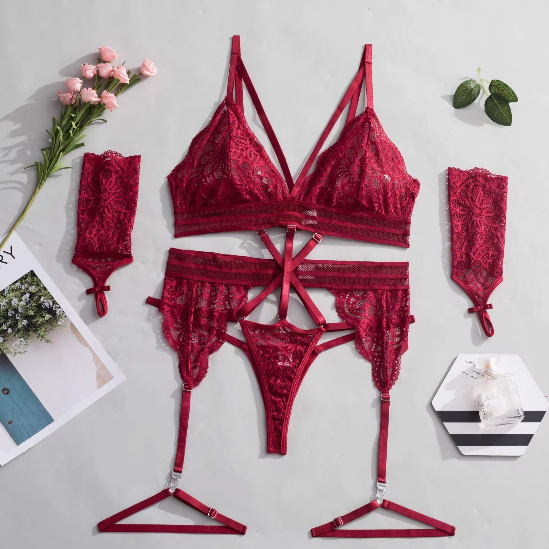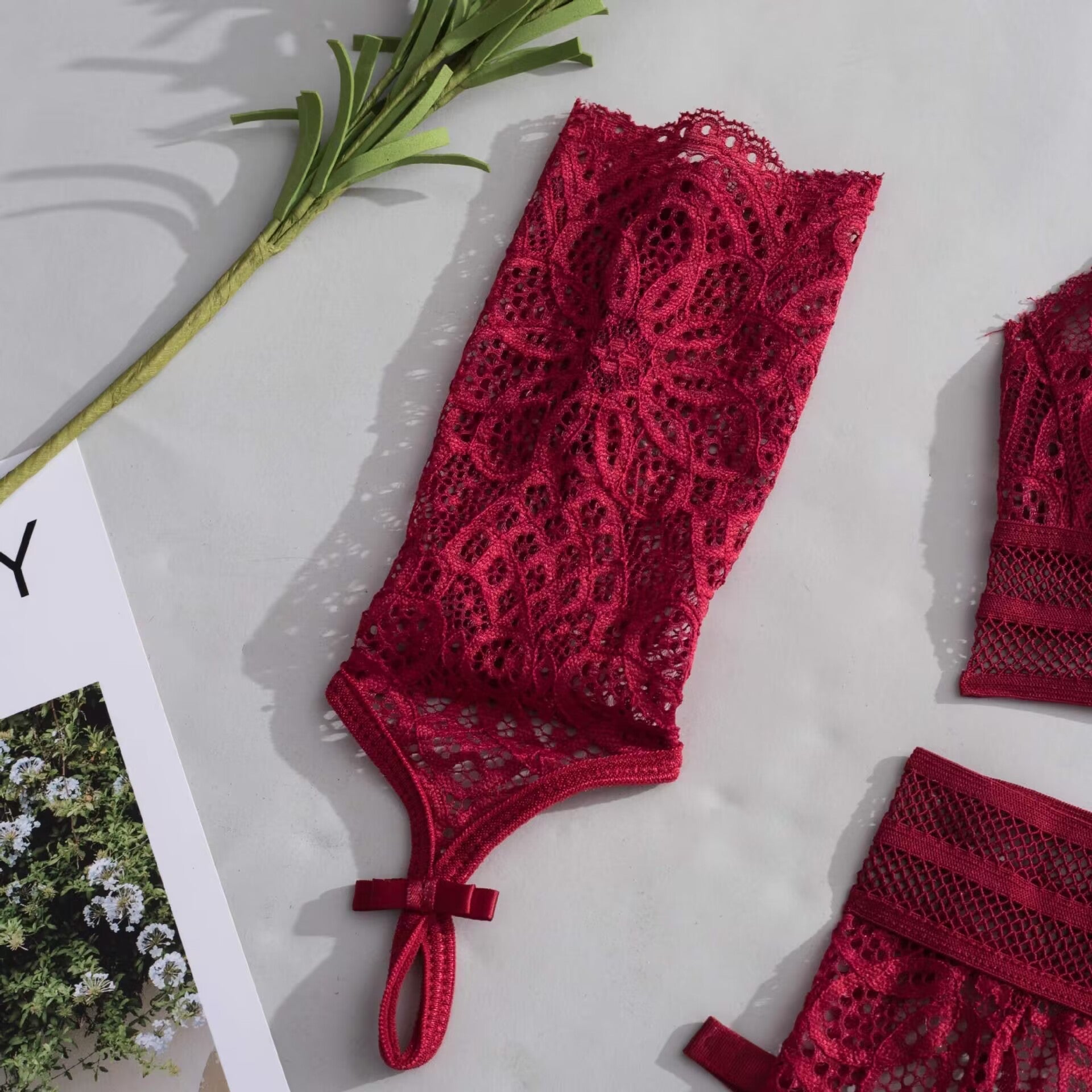 The lace detailing adds a touch of elegance and femininity. while the thong and gloves complete the look.