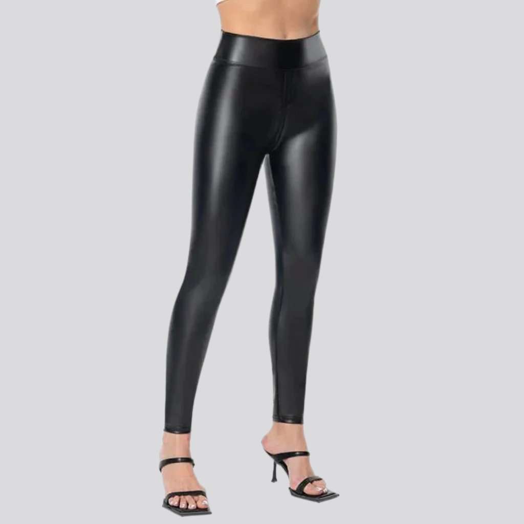 These high-waisted skinny denim pants are the perfect way to stand out from the crowd. The Y2K inspired design. pu-leather fabric. and flattering fit type will have you feeling confident and chic. The perfect piece for day-to-day wear or a special night out. these pants are sure to make a statement!