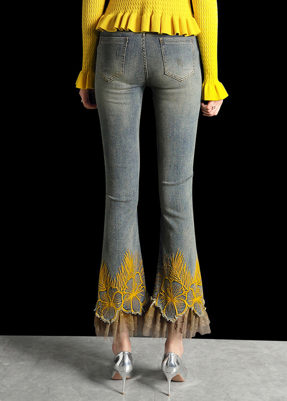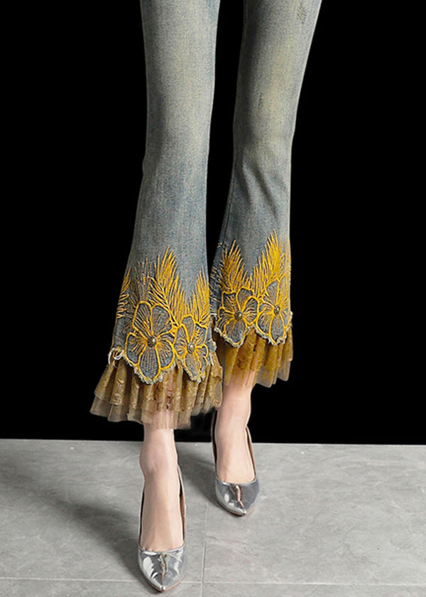 Italian Denim Blue Wraped High Waist Embroideried Pockets Patchwork Tulle Cotton Flare Pants Summer Fabric: Cotton Blended Size & Fit: This garment fits true to size. Length: Size S measures 39.39"from waist to hem. Waist:Fitted - very fitted at natural waist Hip: Loosely Fitted. room for hips. Hand Wash Cold.