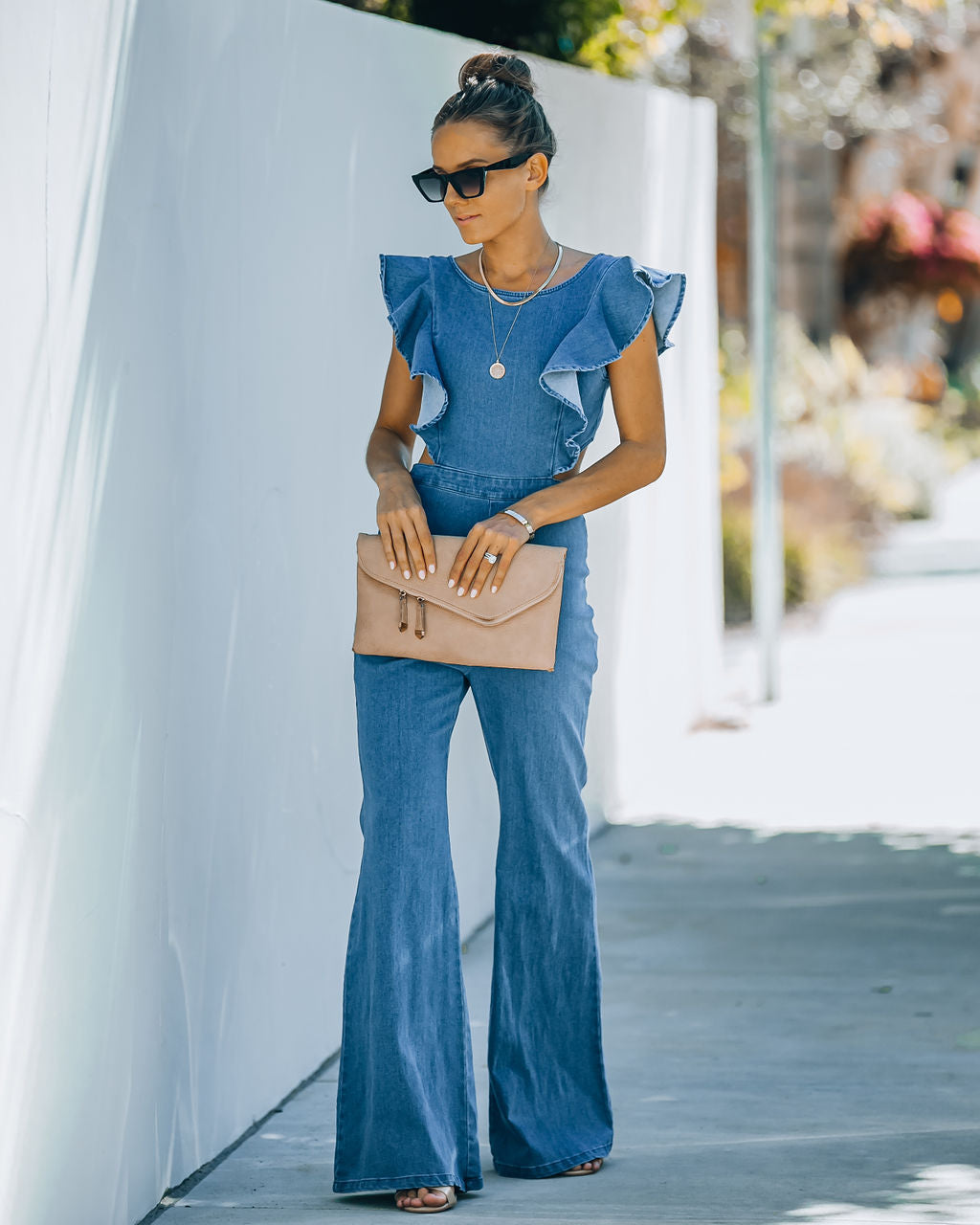 //Best Seller// Fun and flirty is the Kadie Cotton Blend Flared Denim Jumpsuit in a medium wash with a scooped neckline.