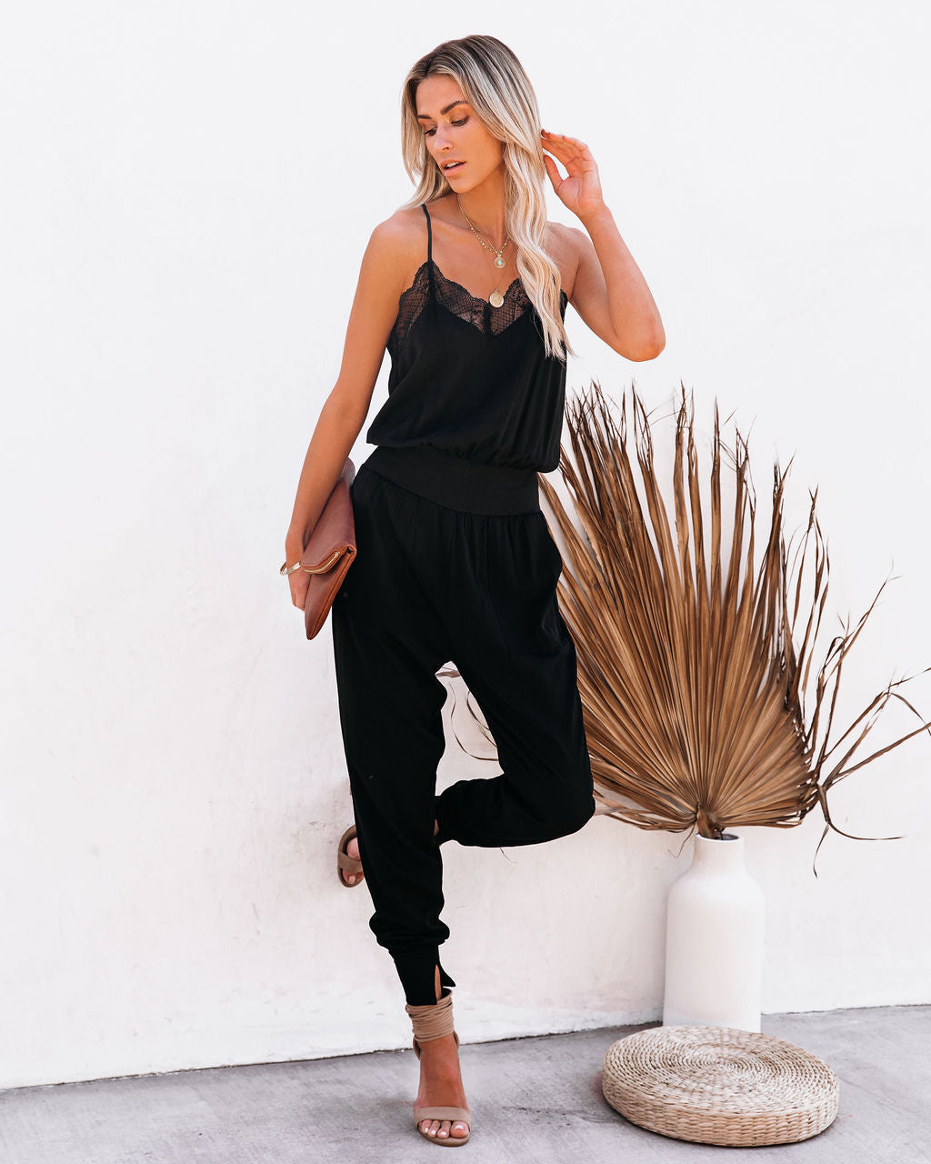 Our two best-selling pieces in one! This fire jumpsuit is as if our Delicate Balance Lace Cami and our Hot And Bothered Joggers got married. The Kaylie Tencel Pocketed Lace Cami Jumpsuit has a no stretch black colored tencel fabric with a sexy lace trim. Finished with side pockets and a knit waist. Styled with the Chloe Mini Necklace. Turquoise Medallion Necklace. The Buddha Wheel Necklace. Simple Bangle Bracelet. Stella Crossbody Envelope Zip Clutch. and Blair Faux Suede Strappy Heeled Sandal.