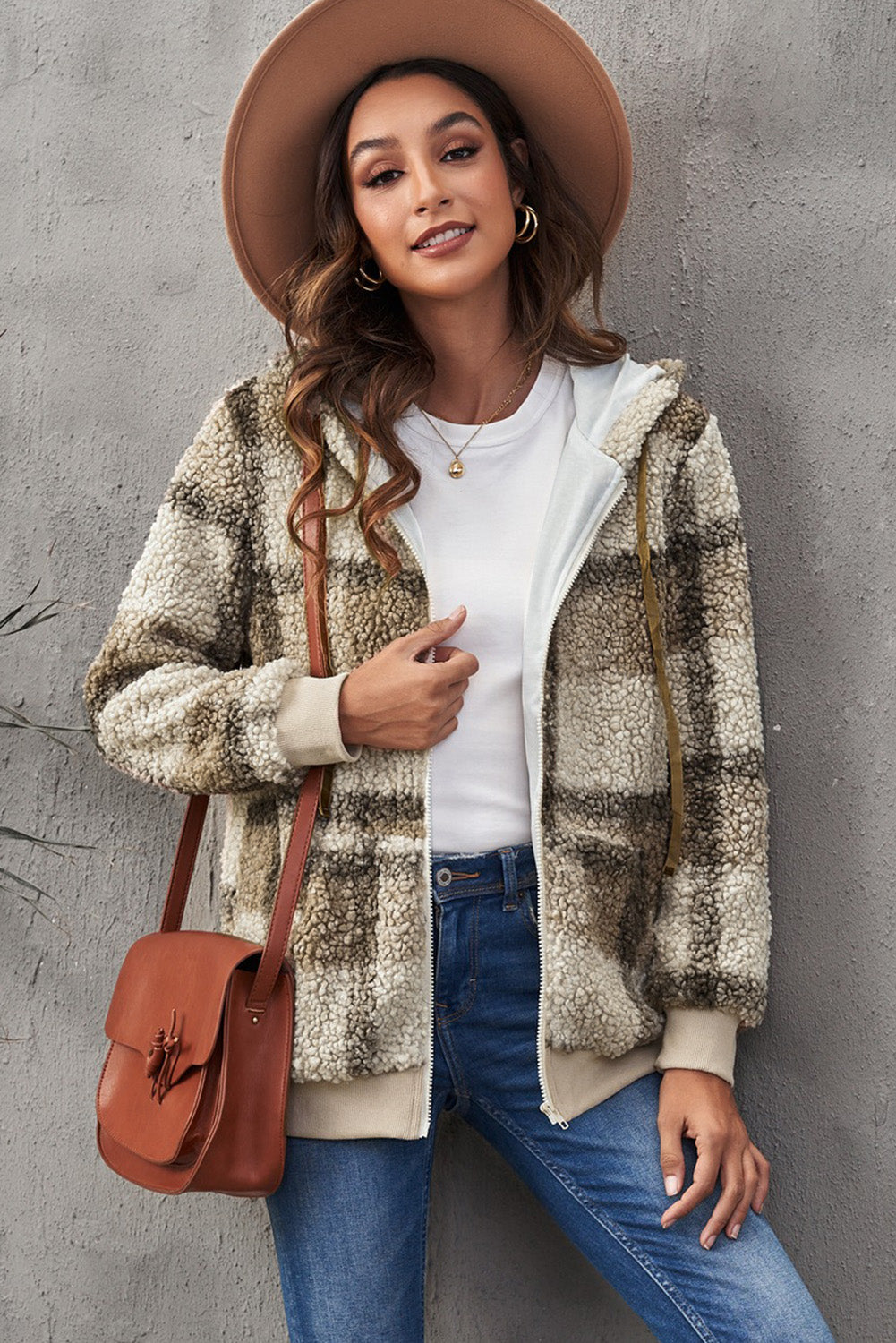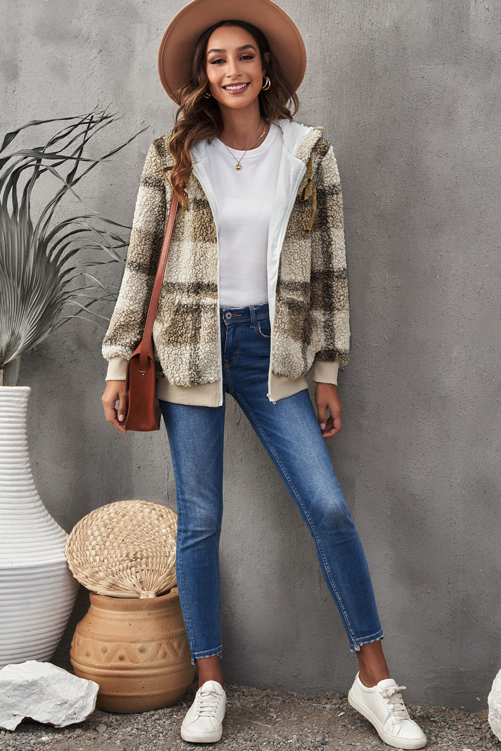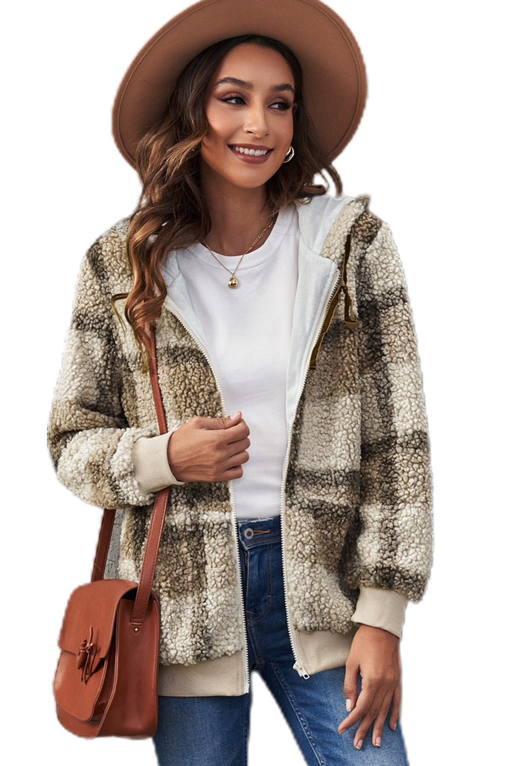 With its timeless style and cozy feel. the Khaki Plaid Print Zipper Fleece Hooded Coat is sure to become your go-to piece this season.