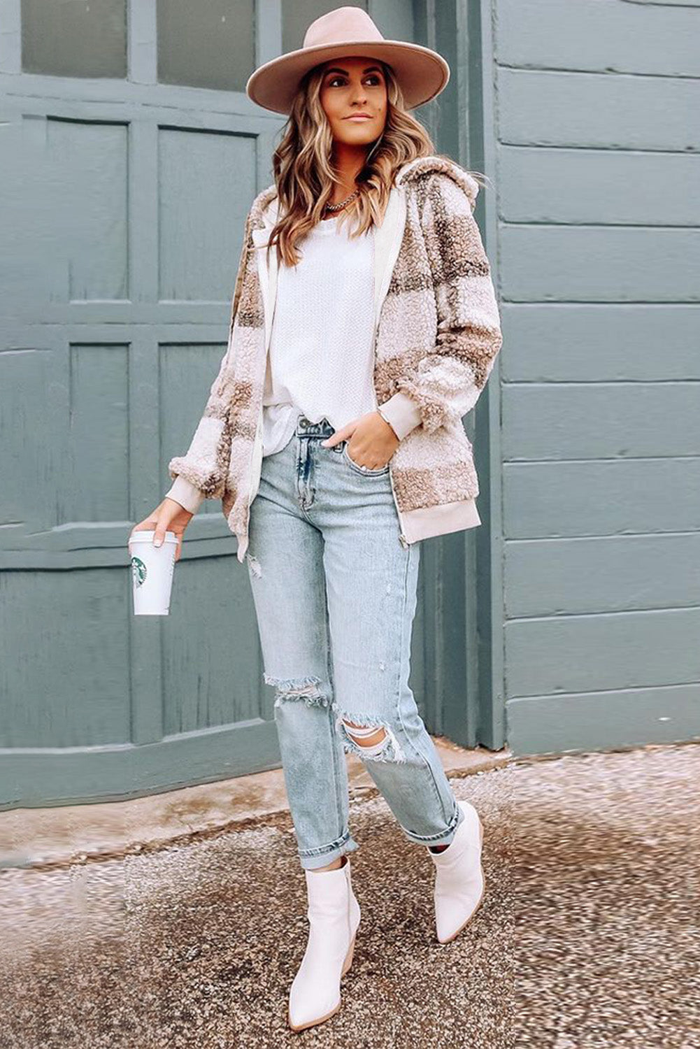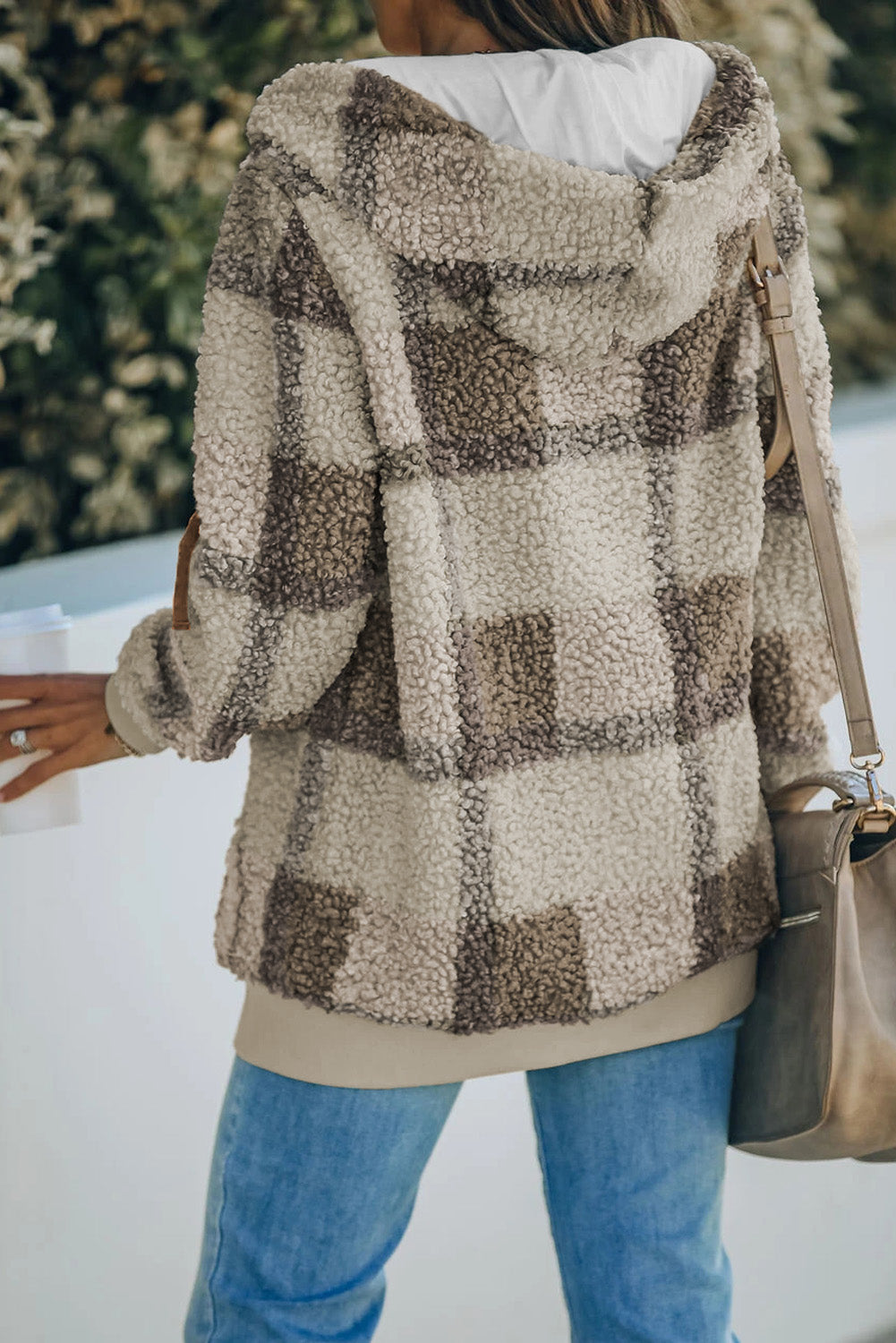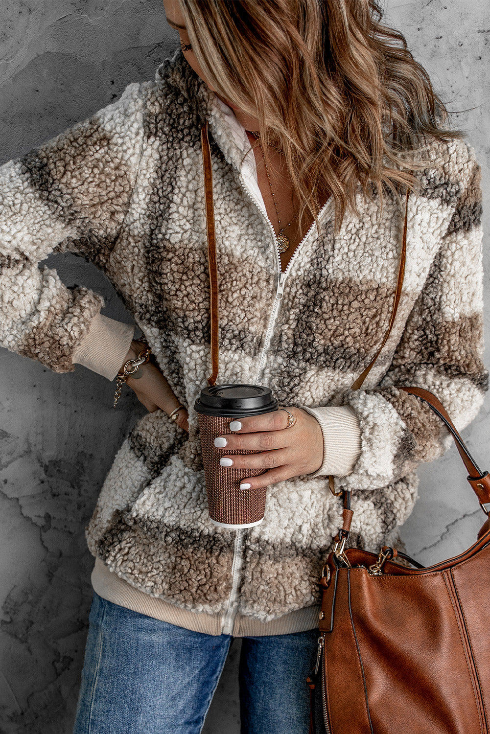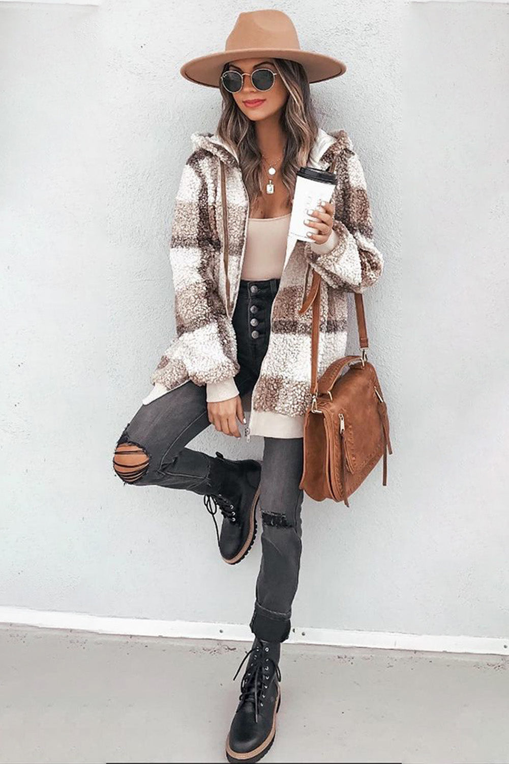 With its timeless style and cozy feel. the Khaki Plaid Print Zipper Fleece Hooded Coat is sure to become your go-to piece this season.