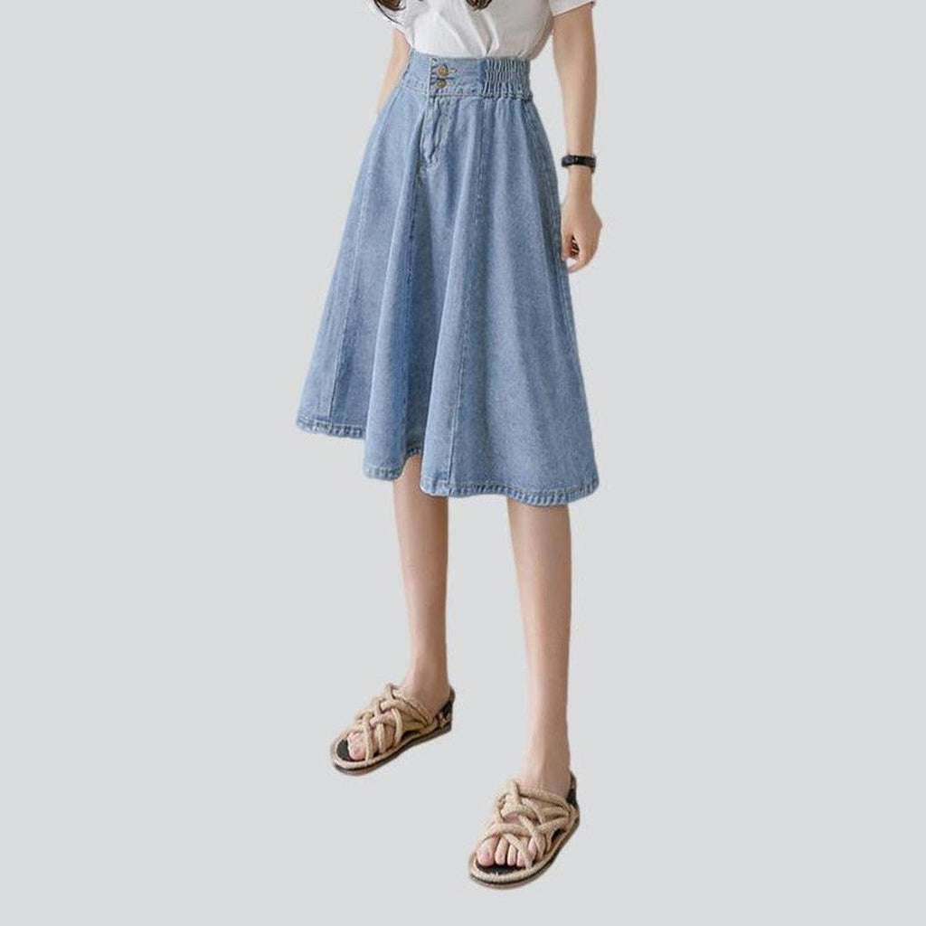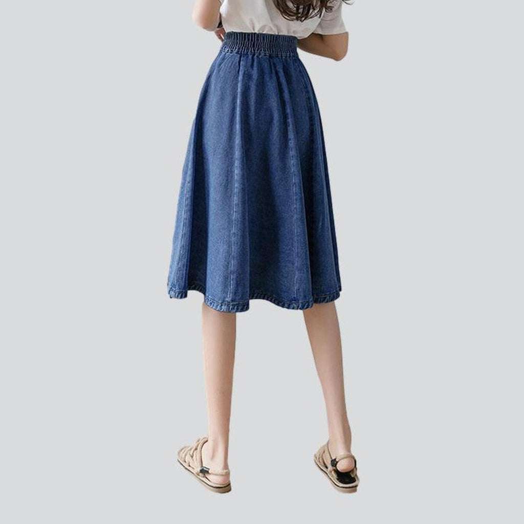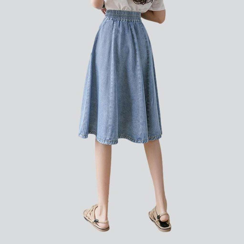 Take your style to the streets with 2023 Spring-Summer Collection's knee-length fit and flare denim skirt! The perfect combination of street style and contemporary fashion. this stonewashed high-waist skirt is ideal for those who embrace rebellion with sophistication. Its zipper and button closure ensures both functionality and flair. while its distressed pattern captures a raw. unfiltered essence. Crafted with premium quality denim. this denim dream promises durability and high-end style.