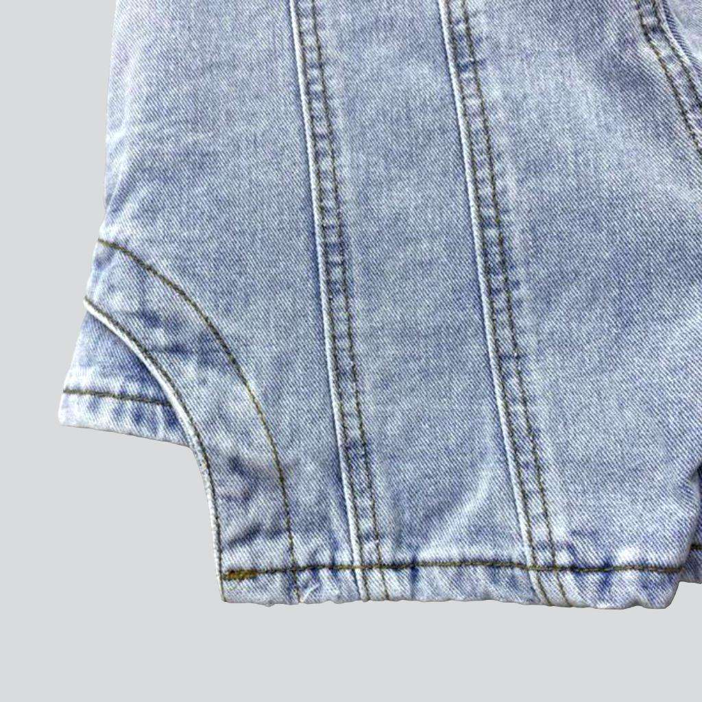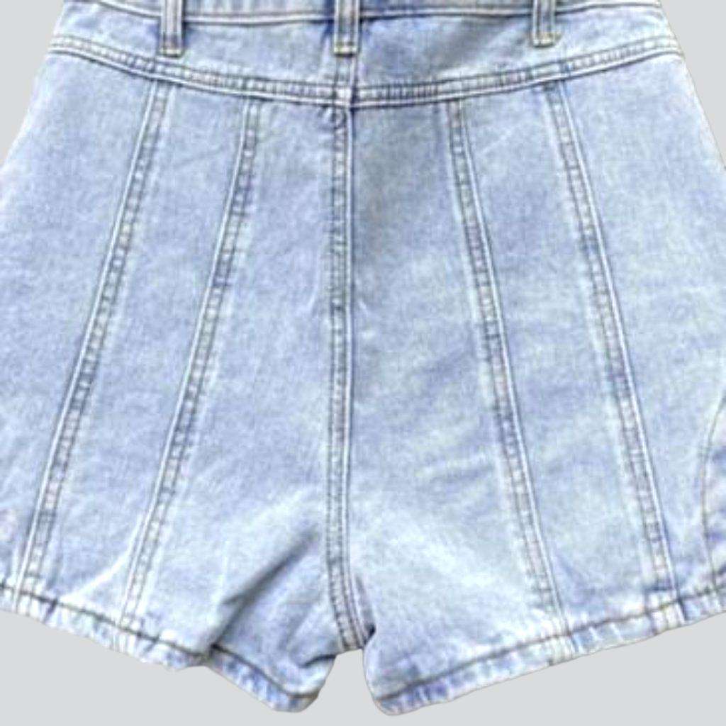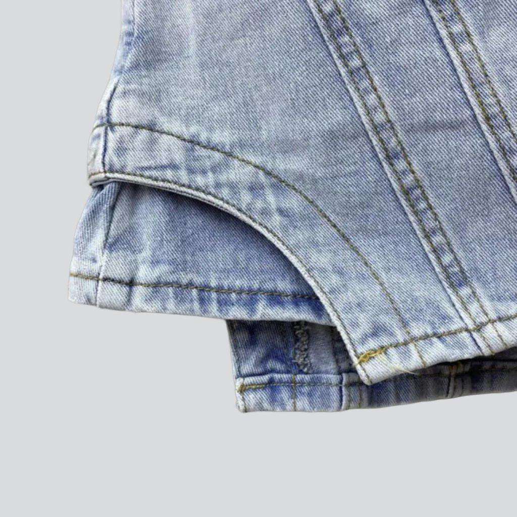 This light wash denim skort is perfect for the fashionable woman who wants to stay ahead of the trends. The layered look and unique fit provides an effortless style that will have you looking chic all day.