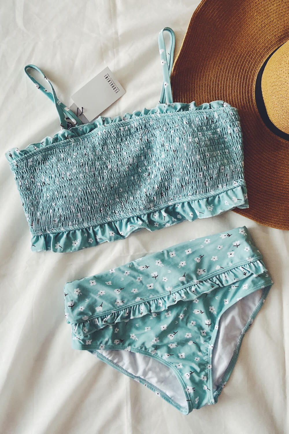 Light Blue Floral Smocked Ruffle Trim Bandeau Bikini Top