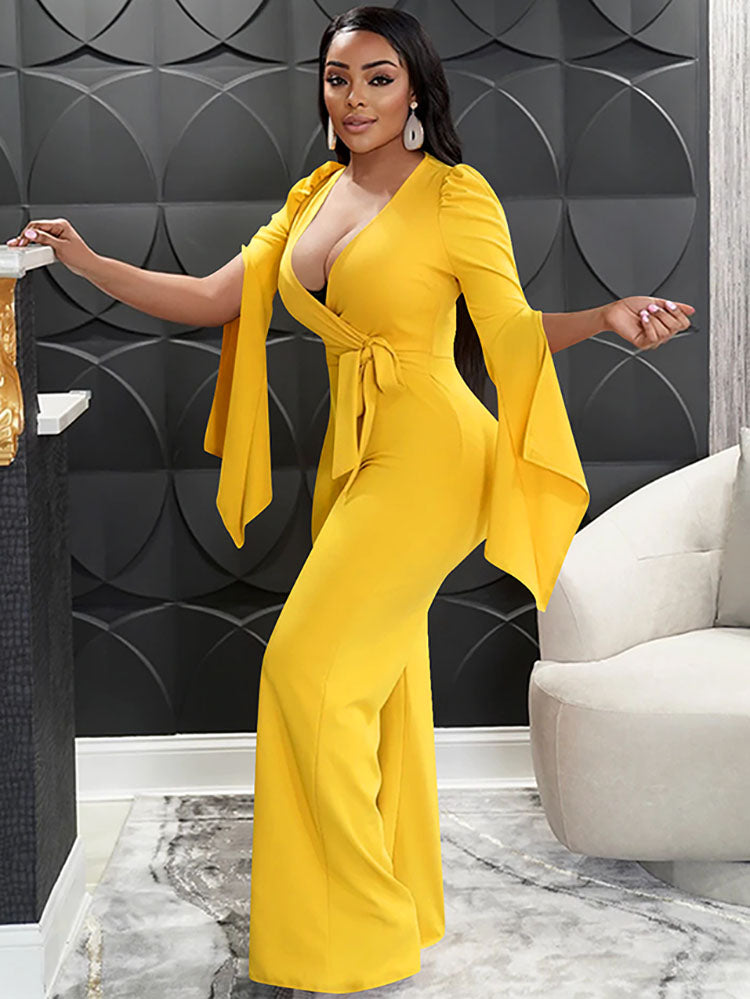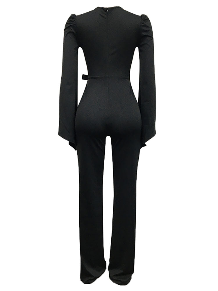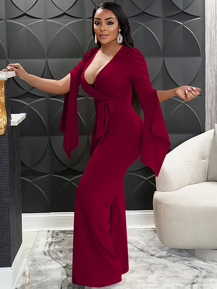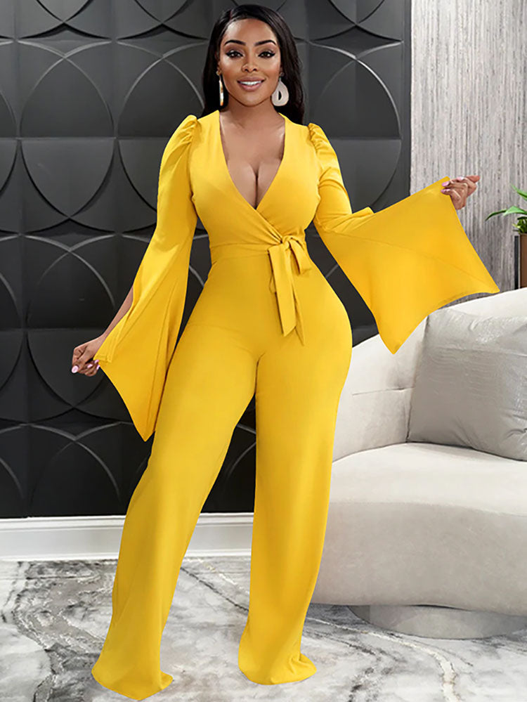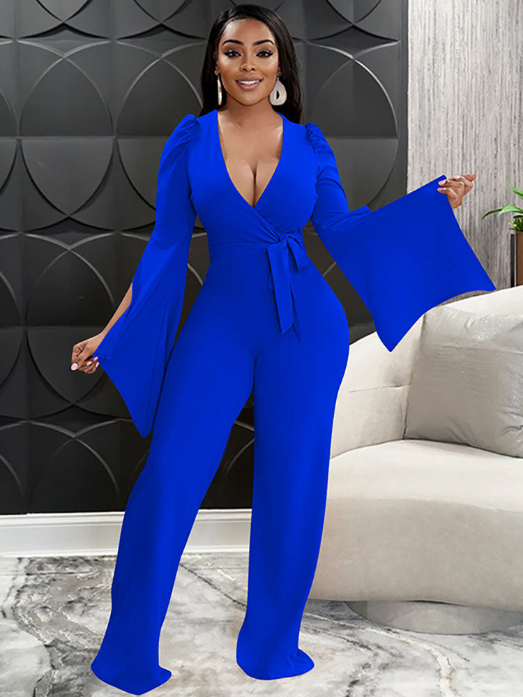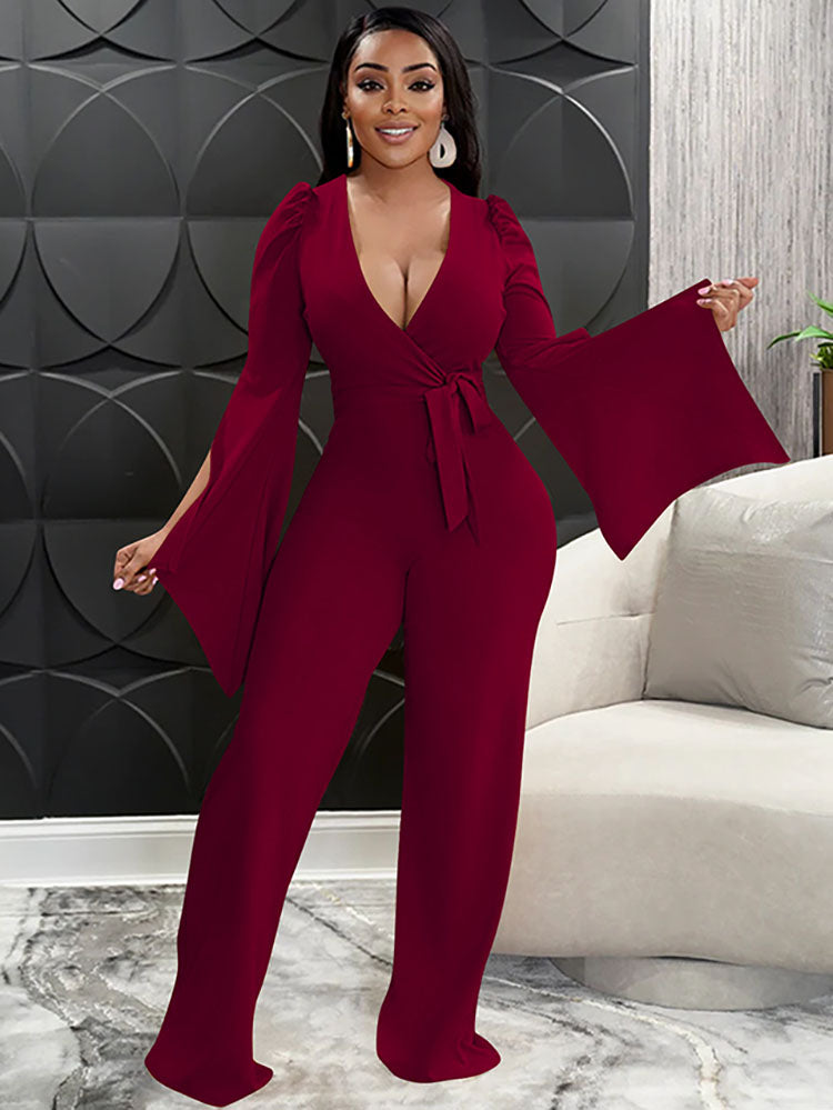 Features: Long sleeve. split. deep v-neck. tie up. solid color. sexy. wide leg. jumpsuits.