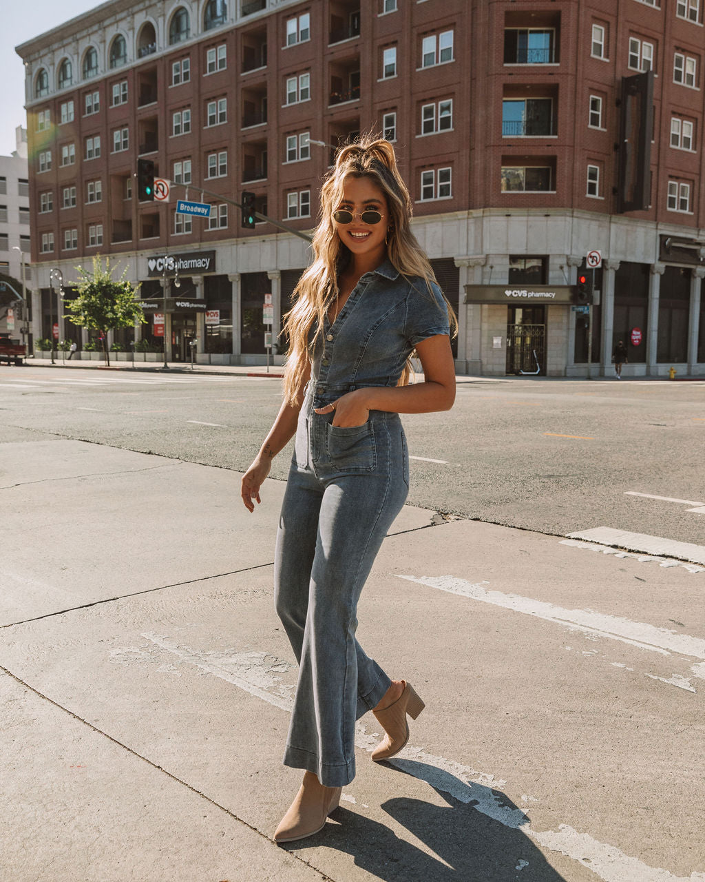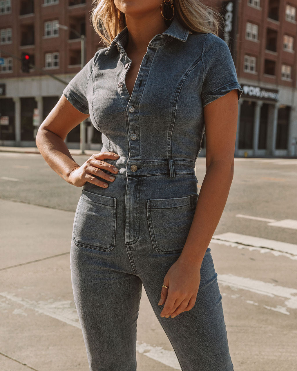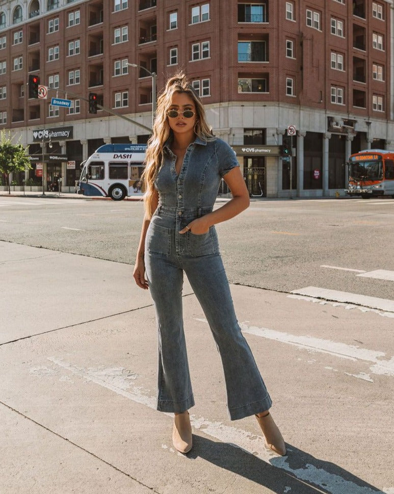 //// The ultimate girl on the go uniform! Our Longmont Pocketed Flared Denim Jumpsuit comes in a medium wash. Crafted with a flared leg and shorts sleeves. Secured with front button closures. Styled with the Kara Double Hoop Earrings and Memphis Faux Suede Heeled Mule.