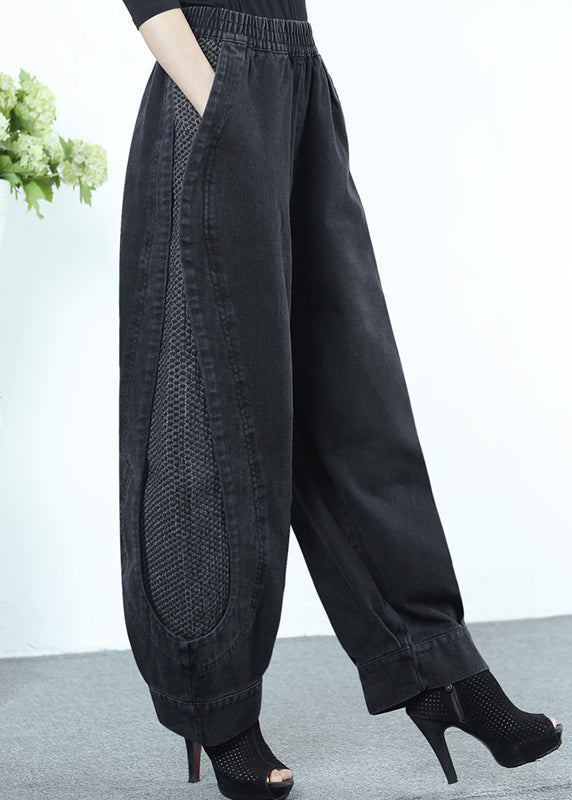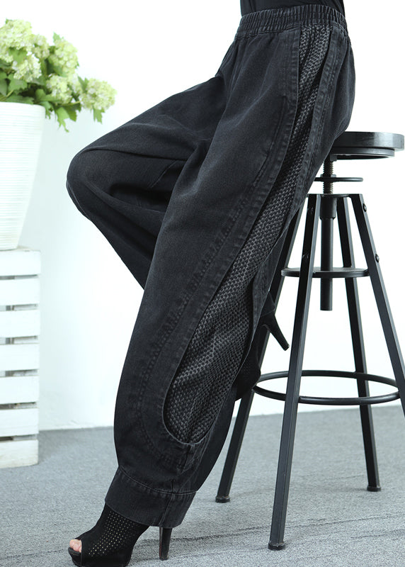 Loose Black Grey Patchwork Elastic Waist Denim Crop Pants Fall Fabric: Cotton Blended Size & Fit: Fit: This garment fits true to size. Length: Size XL measures 38.22"from shoulder to hem Bust: Great for any cup size. Waist: Loose Fit. Comfortable room throughout midsection. Hip: Loose Fit - room for hips. Hand Wash Cold.