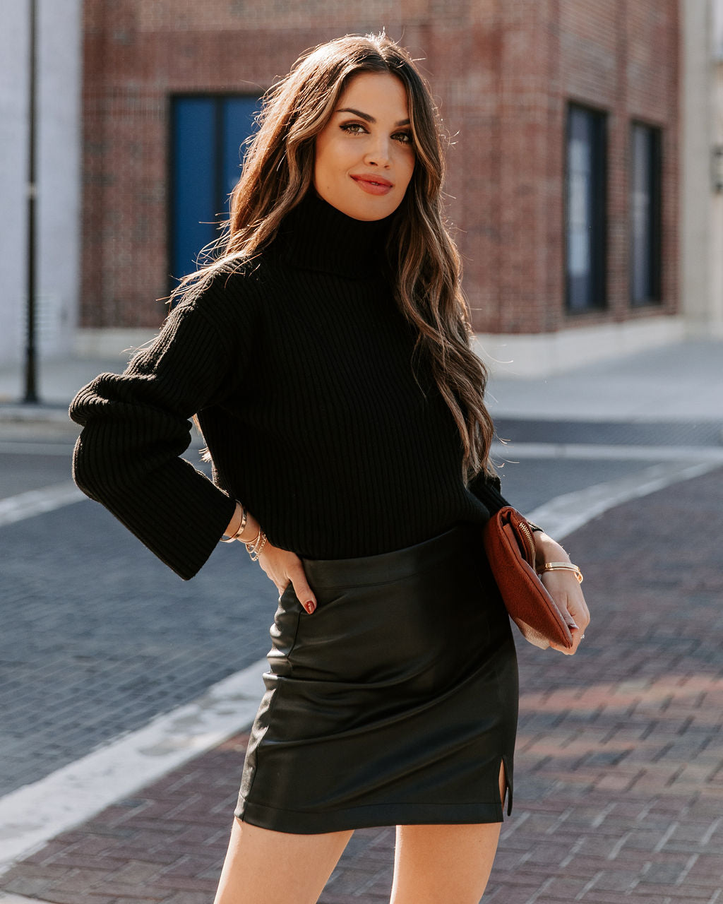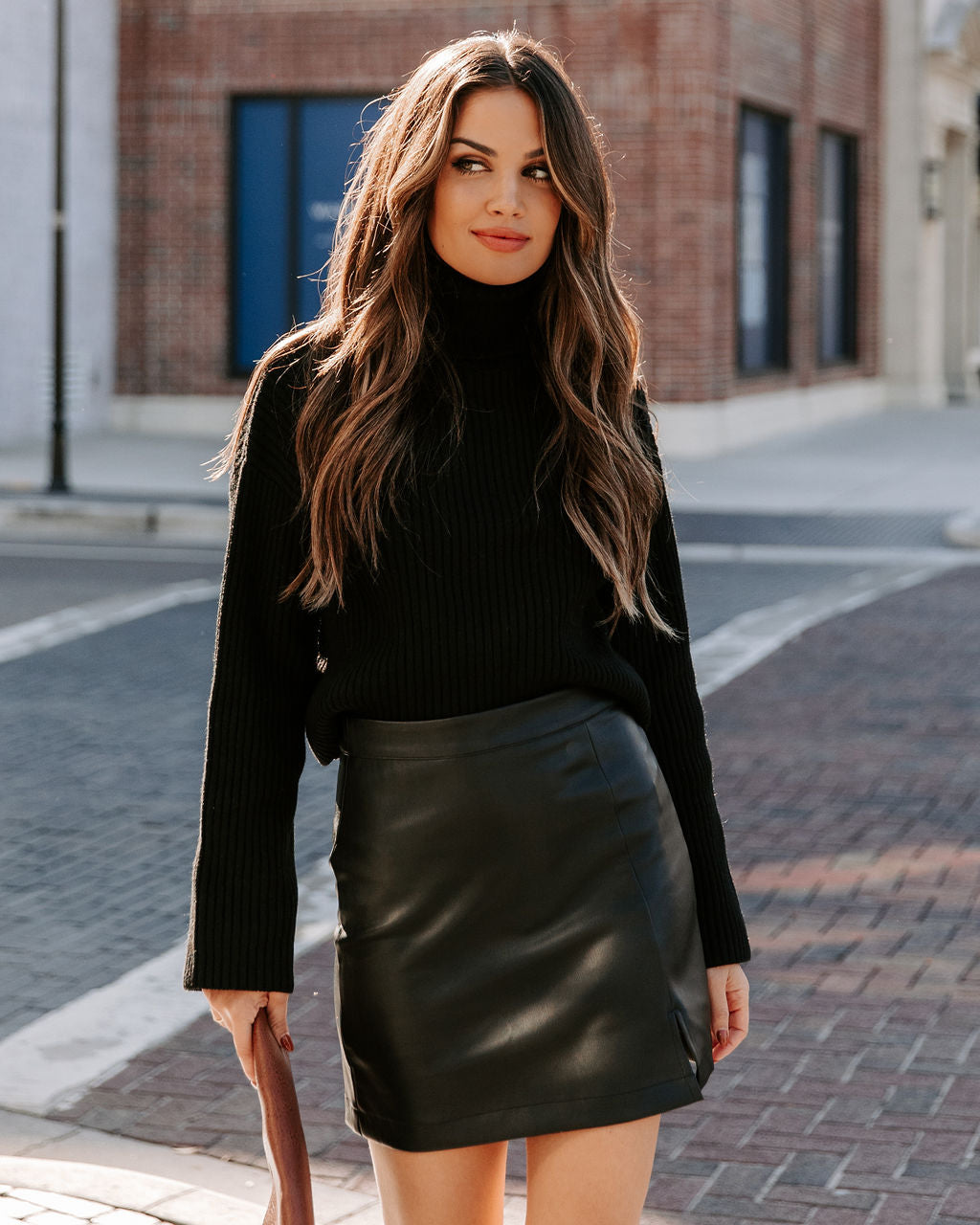 We'll take anything in faux leather please! Our Mazine Faux Leather Mini Skirt in black is detailed with a front slit. Designed with a structured waistband and a back zipper closure. Styled with the Mercury Hoops. Simple Bangle Bracelet. Stella Crossbody Envelope Zip Clutch. Kaylon Ribbed Turtleneck Knit Sweater. and Saint Slouch Boot.