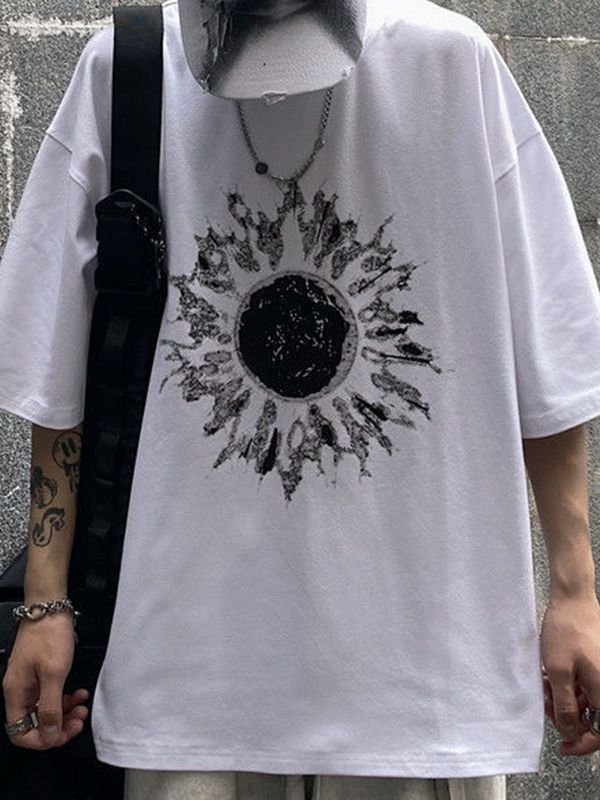 -Graphic design: The sun graphic on the tee is visually striking and adds a unique touch to any outfit.