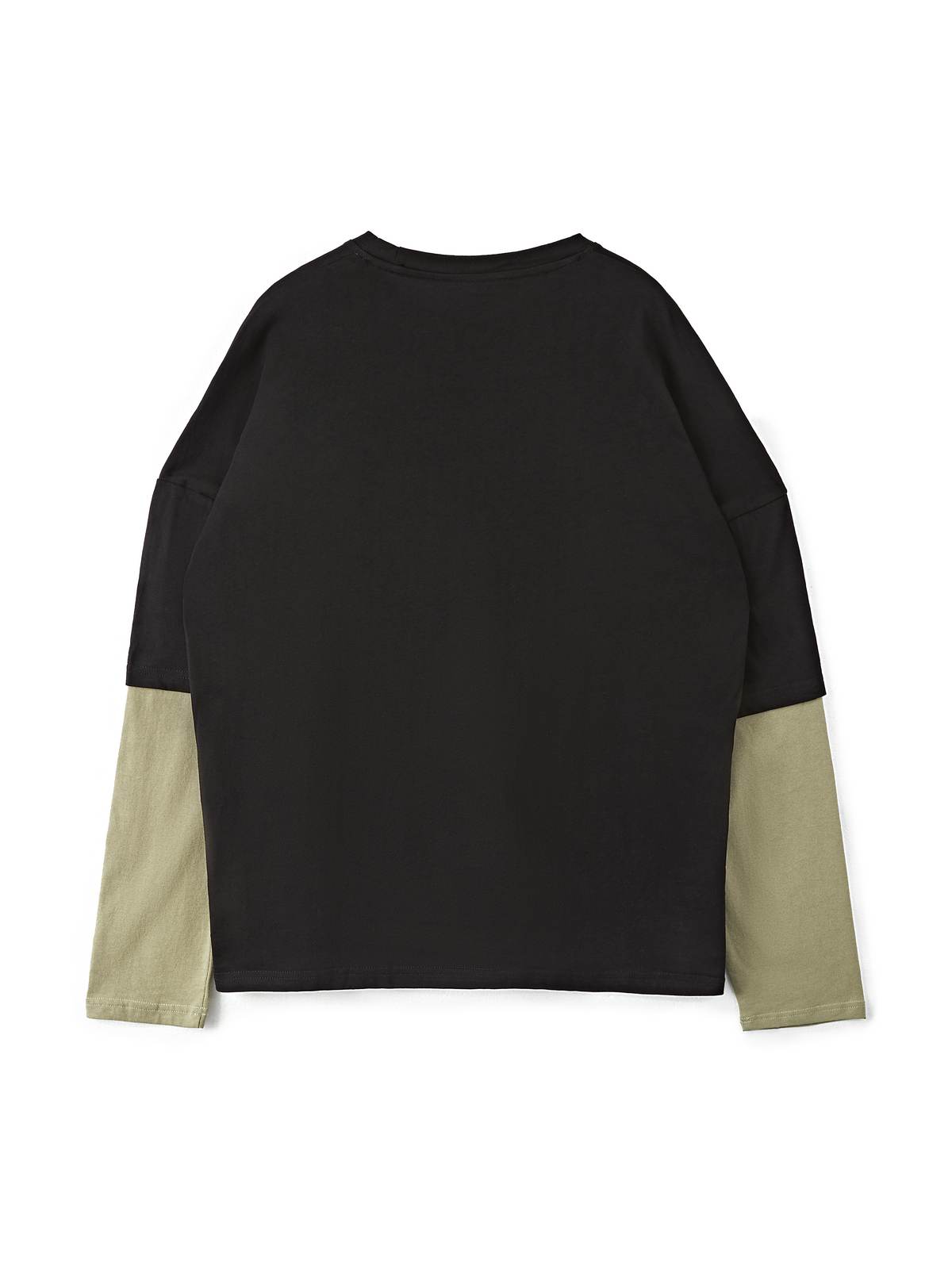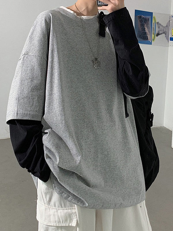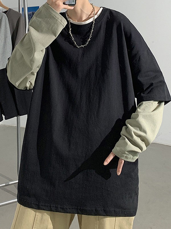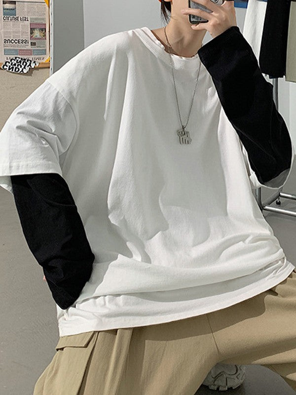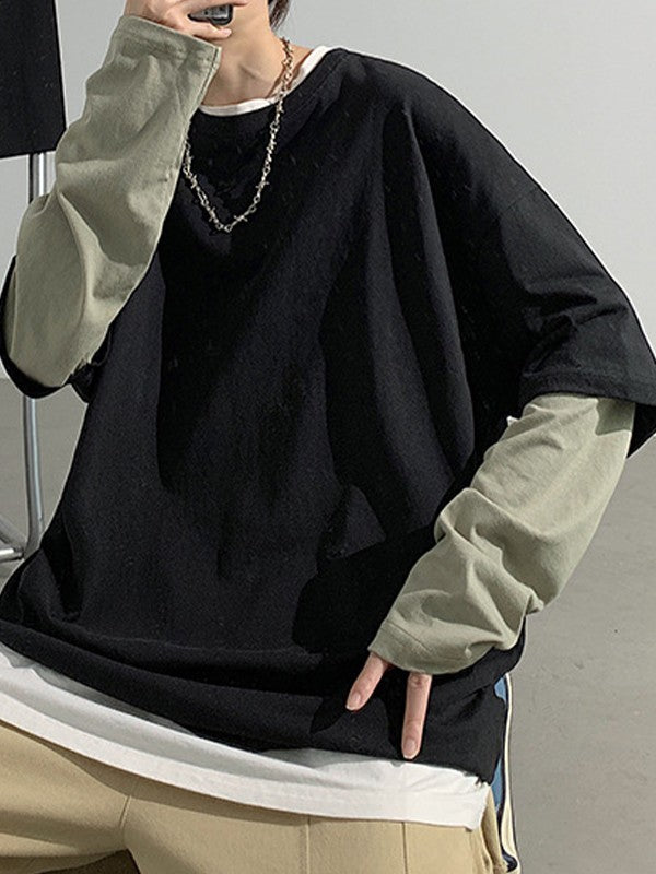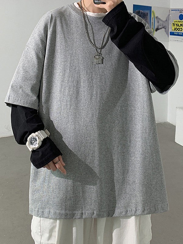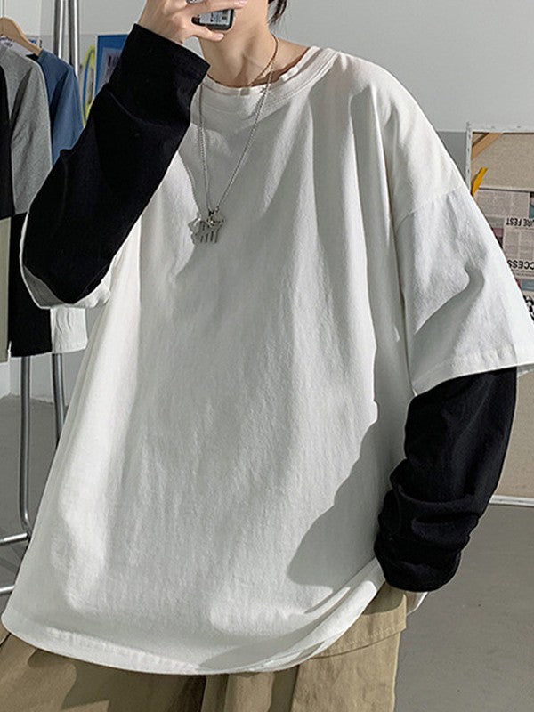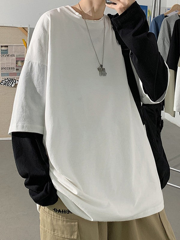 Description: These fake two-piece long sleeve tees are staple for back to school vibes or street looks. Made from comfy cotton fabric. cuts to a flattering silhouette. features contrast patchwork long sleeves design.