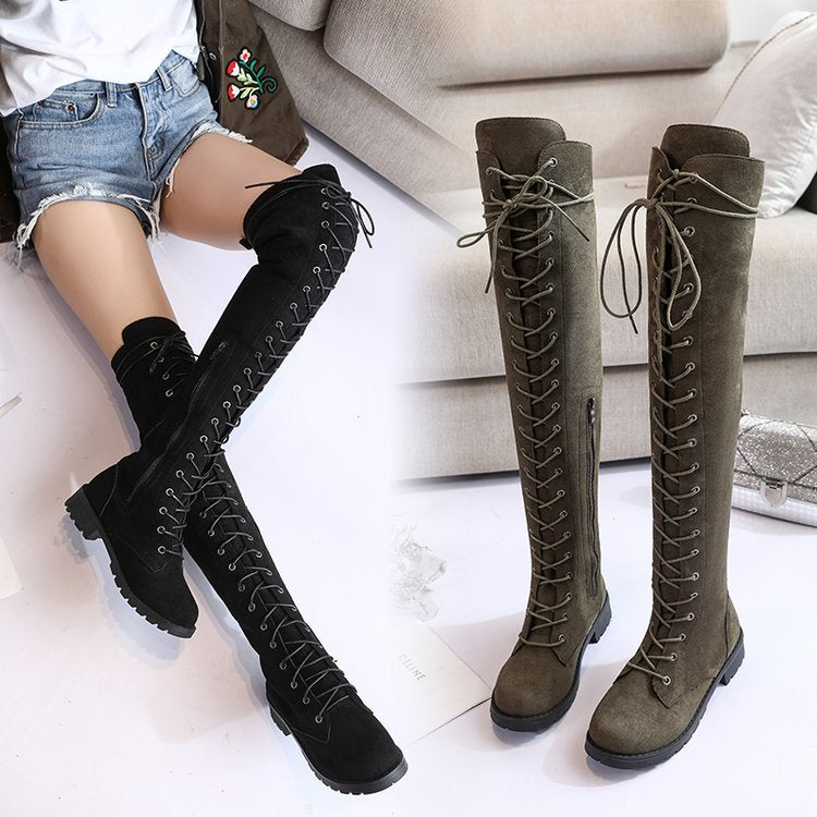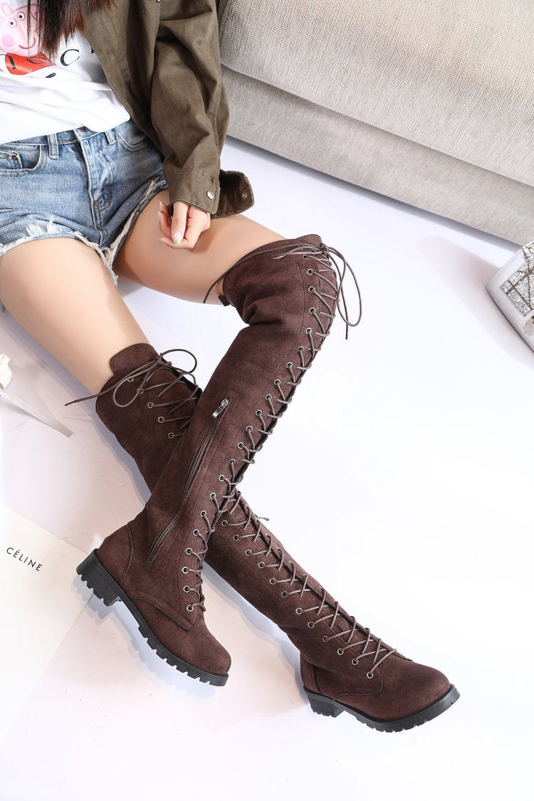 Steal the scene in these sassy over-the-knee boots featuring a trendy pointed-toe. stiletto heel. side bungee lace-up sides. and inner zipper closure. composed of smooth faux suede material. Complete the look in a short dress for a night on the town!