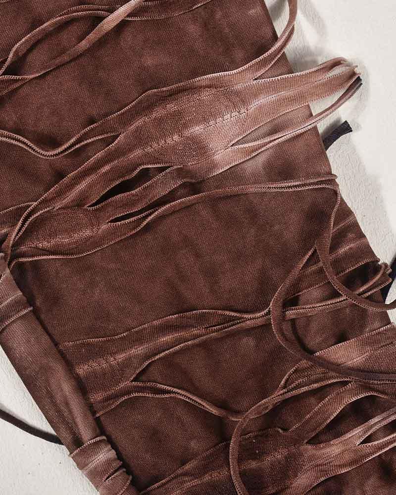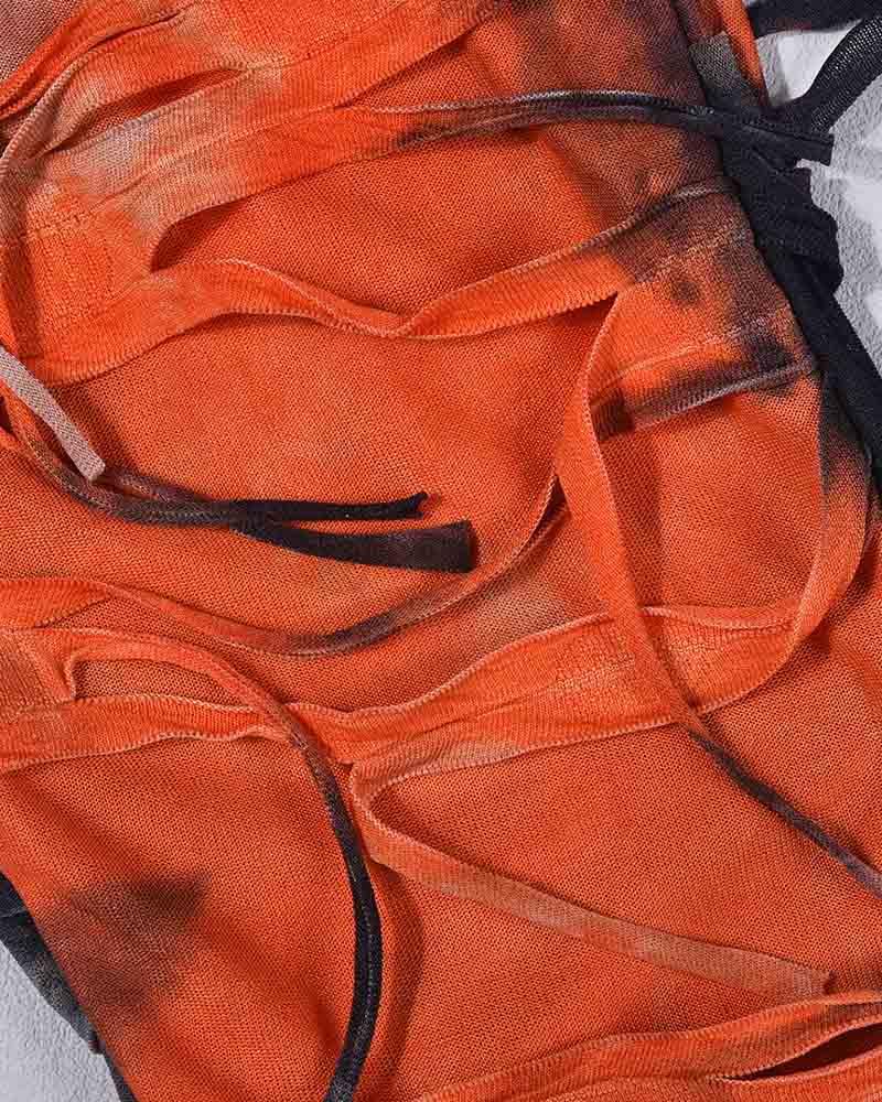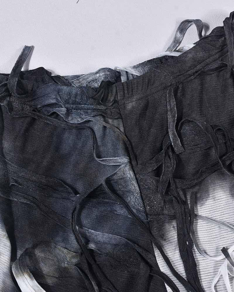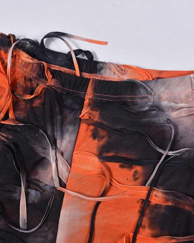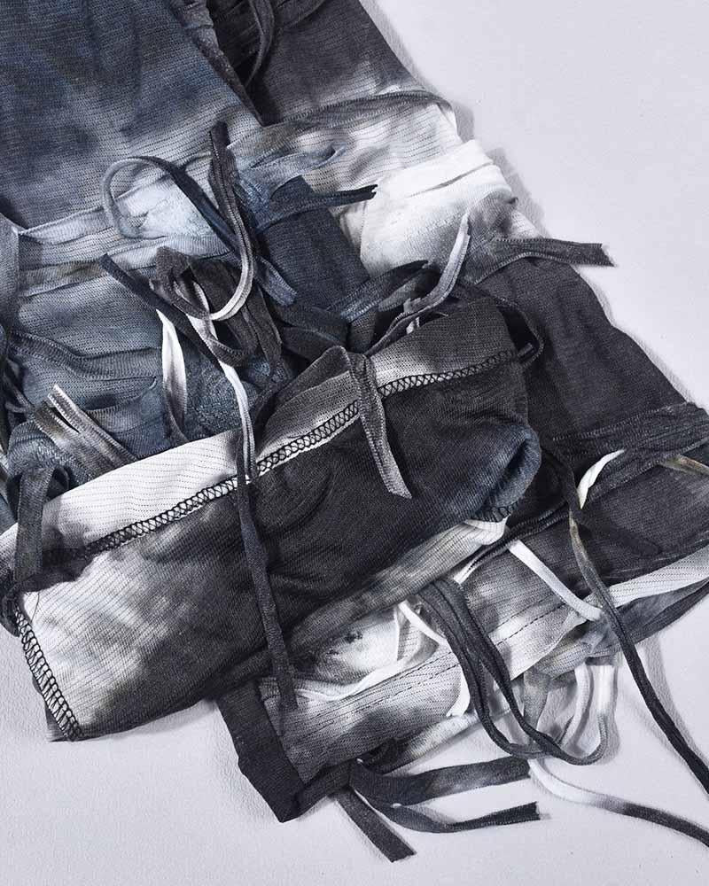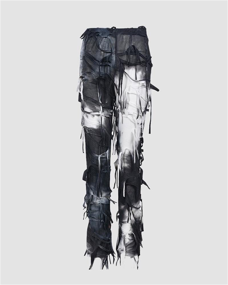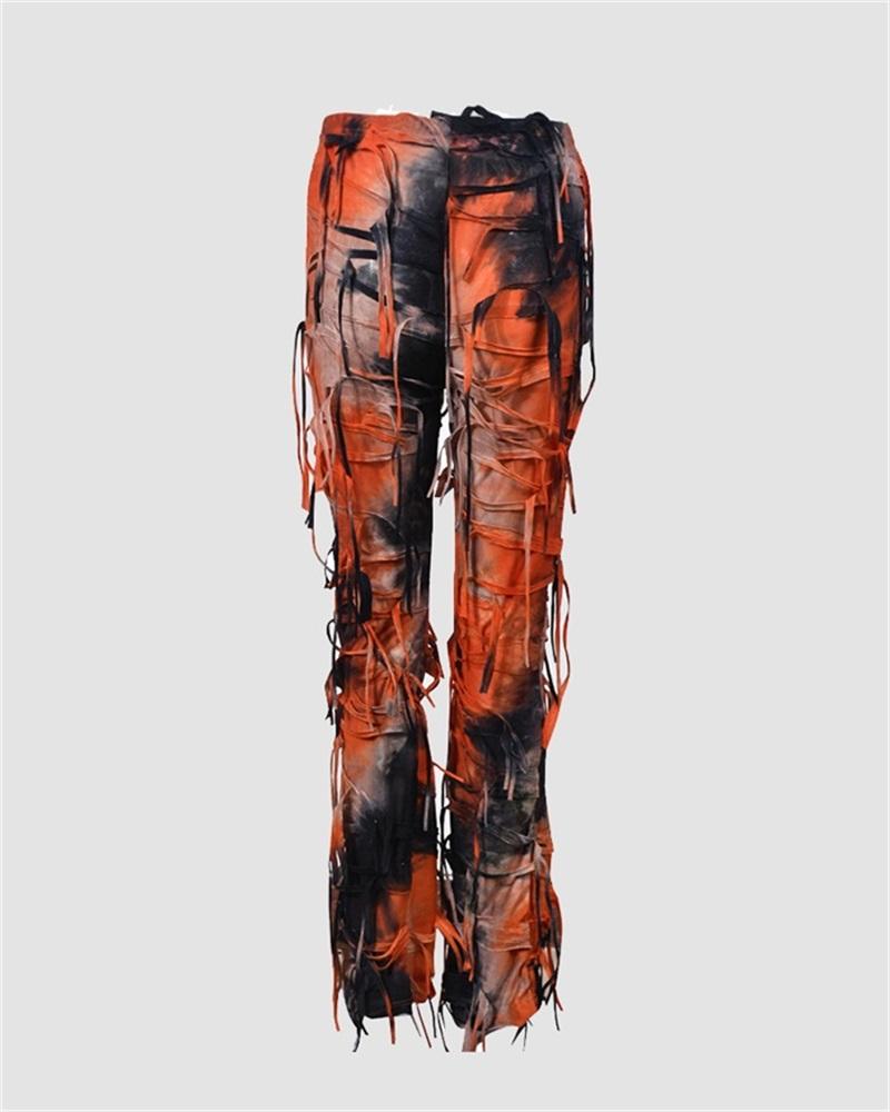 Details: Long pants with tie-dye design and rip-off details