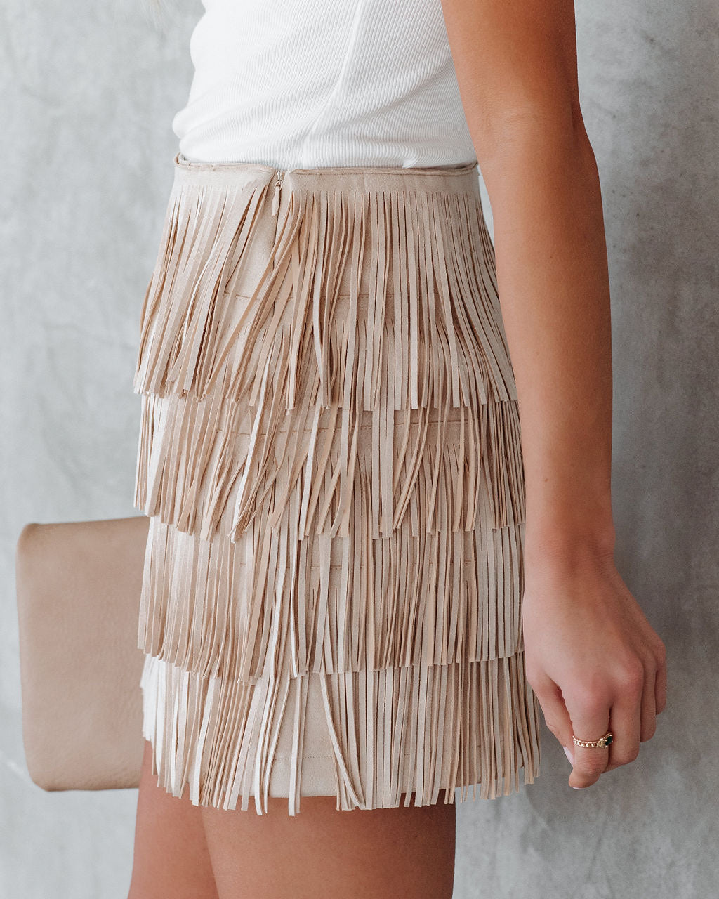 //Best Selling Silhouette// New Color// The Nitza Faux Suede Fringe Mini Skirt delivers major rock concert energy in its san faux suede hue with a structured waistband and fringe details.