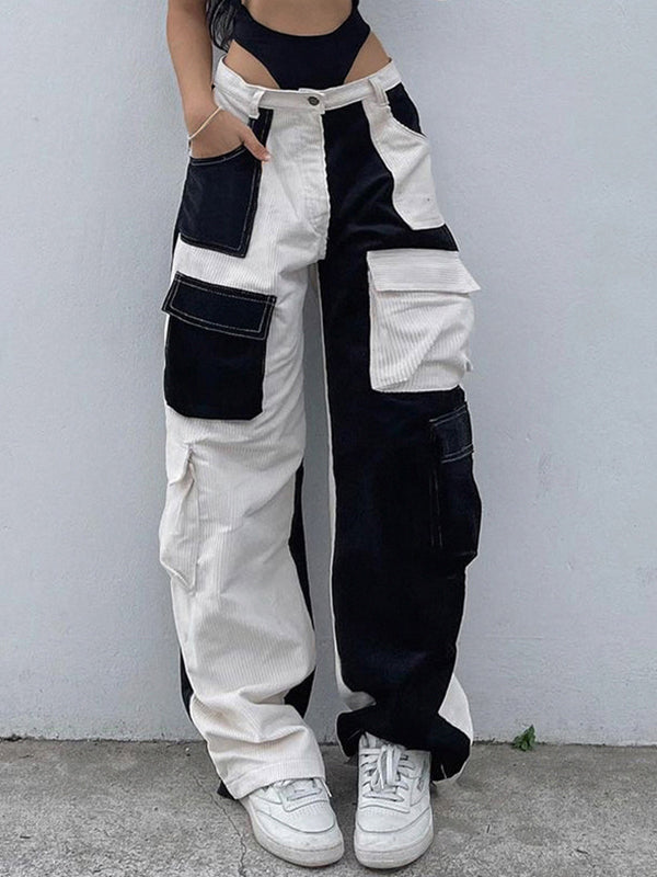 Description: Cargo pants are must have for 90s wardrobes. they are trendy and versatile to style. These cargo pants are made from soft corduroy fabric. it's durable and comfortable to wear. Shaped to a flattering-cut silhouette. they have contrast color block paneled style. features functional cargo-style pockets patched to the leg. and finished with a button zip fly design.