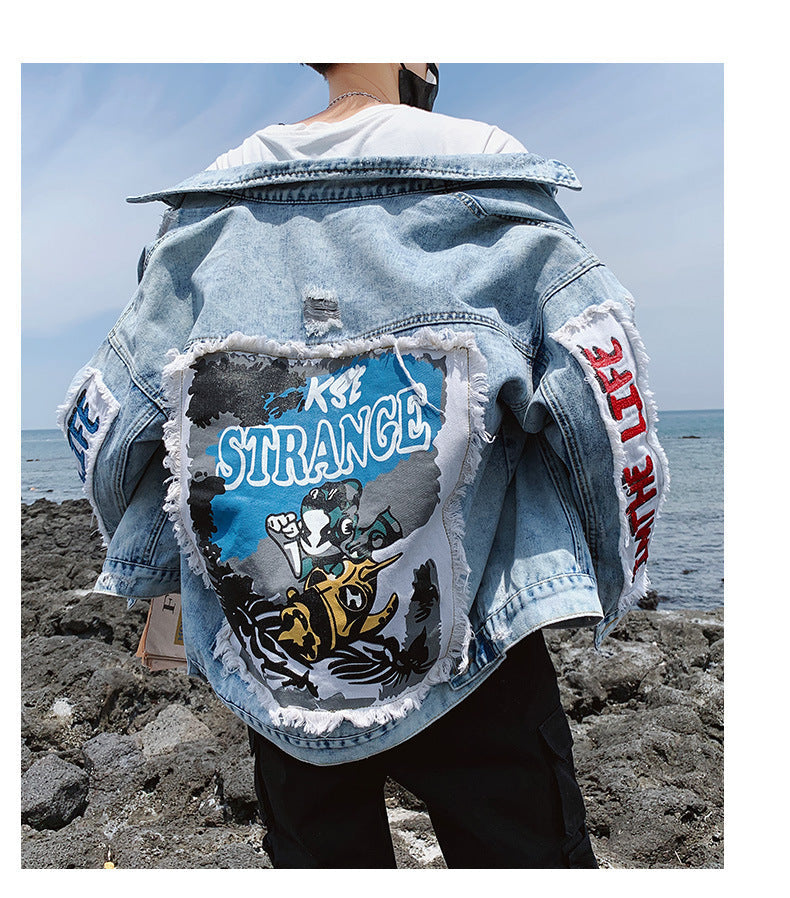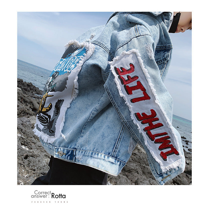 Welcome to the 2023 Spring-Summer Collection and experience true fashion elegance with the large pieced-together jean jacket! Perfectly blending vintage styles and vogue flair. this denim jacket is patterned to add a bold and unique statement to your wardrobe. Offering a distinctive buttoned closure. ripped look. and creative printed design. you'll be sure to look and feel your best in this one-of-a-kind piece.