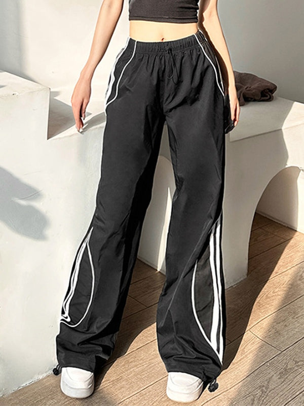 Description: Sits to an elasticated waist with drawstring toggle detail. features piping through the leg. it has contrast striped panels. and with adjustable drawstring cuffs design.