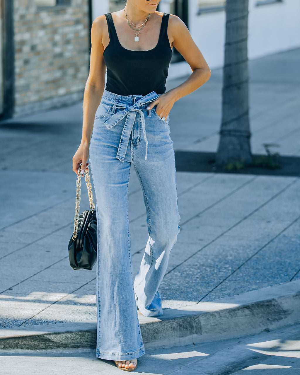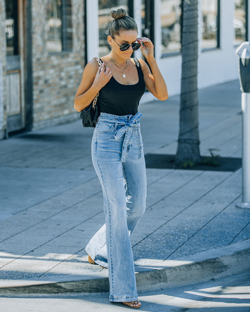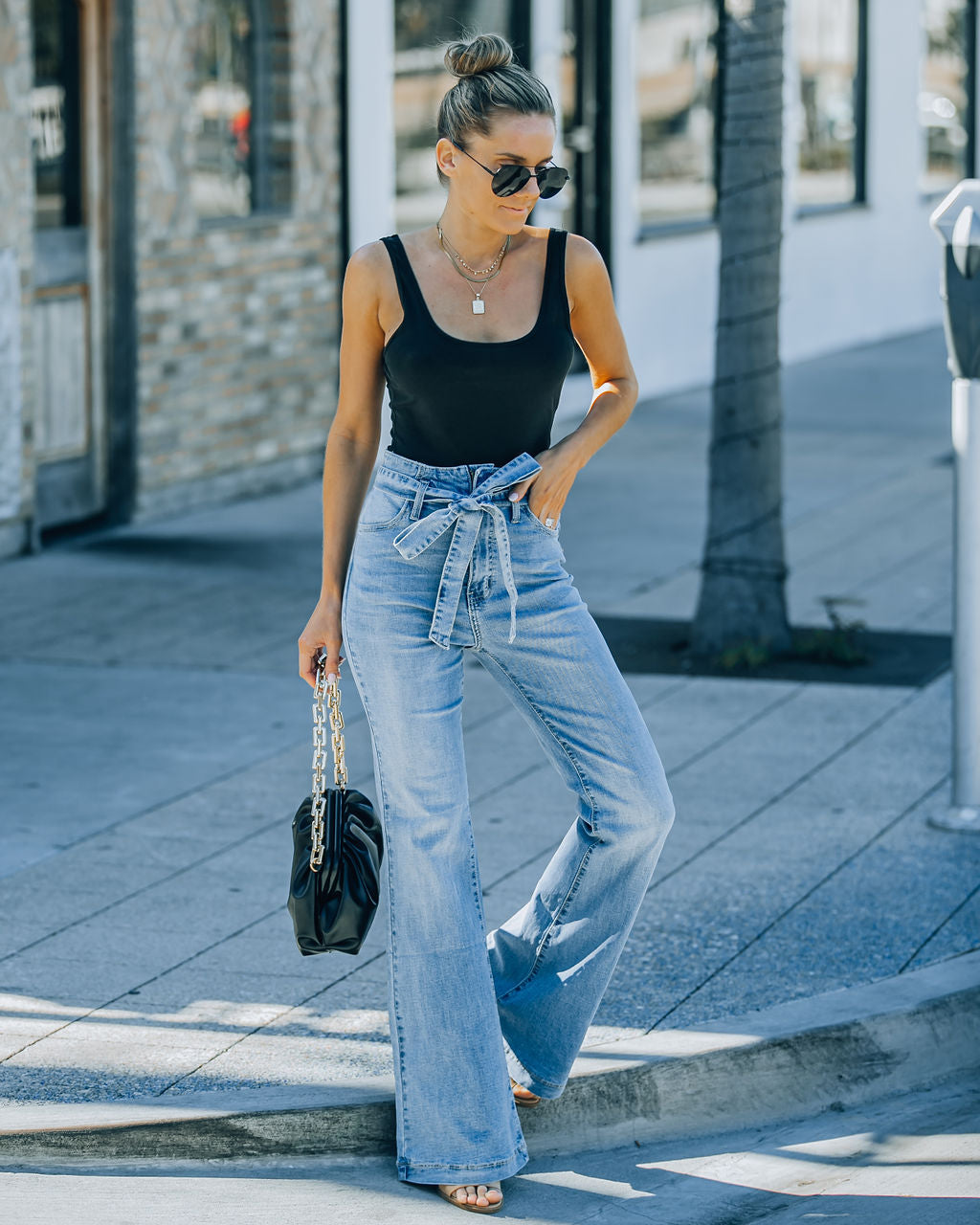 We're completely obsessed with the elevated look of the Poppy High Rise Flare Tie Denim in indigo blue complete with a flare leg and an adjustable waist tie.