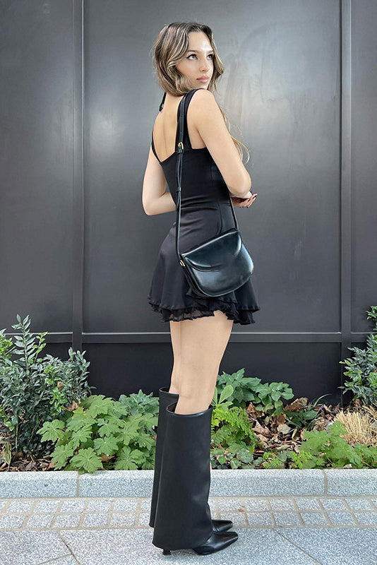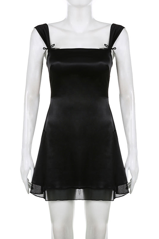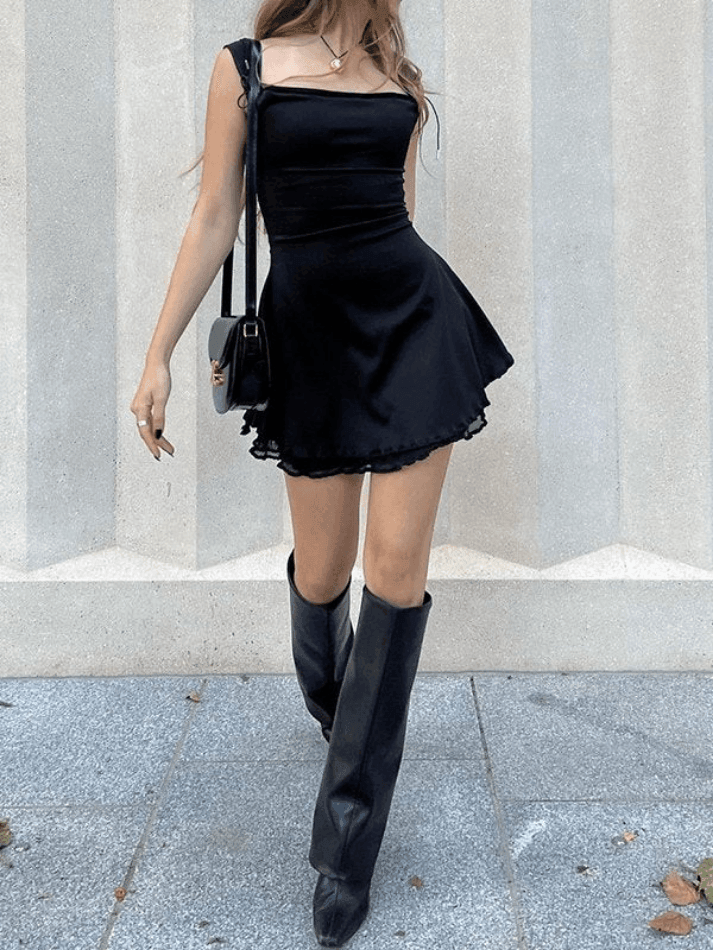 Description: Get ready to turn heads with this flirty black mini dress. Its sleek design and trendy details make it perfect for any occasion. The sleeveless silhouette and straight neckline add a touch of elegance. while the slim fit accentuates your curves. Made from a blend of polyester and spandex. this dress offers a comfortable and flattering fit. Whether you're going out for a casual day or hitting the town for a night out. this dress is a must-have in your wardrobe.
