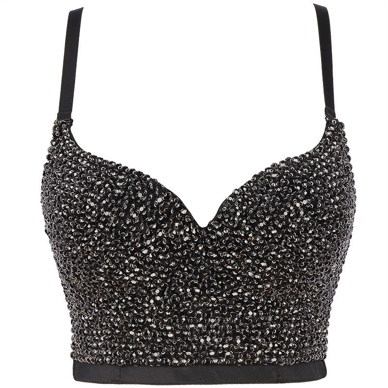Sparkle the evening away with dazzling rhinestones. Featuring removable adjustable shoulder straps and a padded underwire bodice. this embellished cropped bustier is designed with boned sides and an adjustable back hook-and-eye closure. Back of bustier is made from a smooth fabric with a hint of stretch.