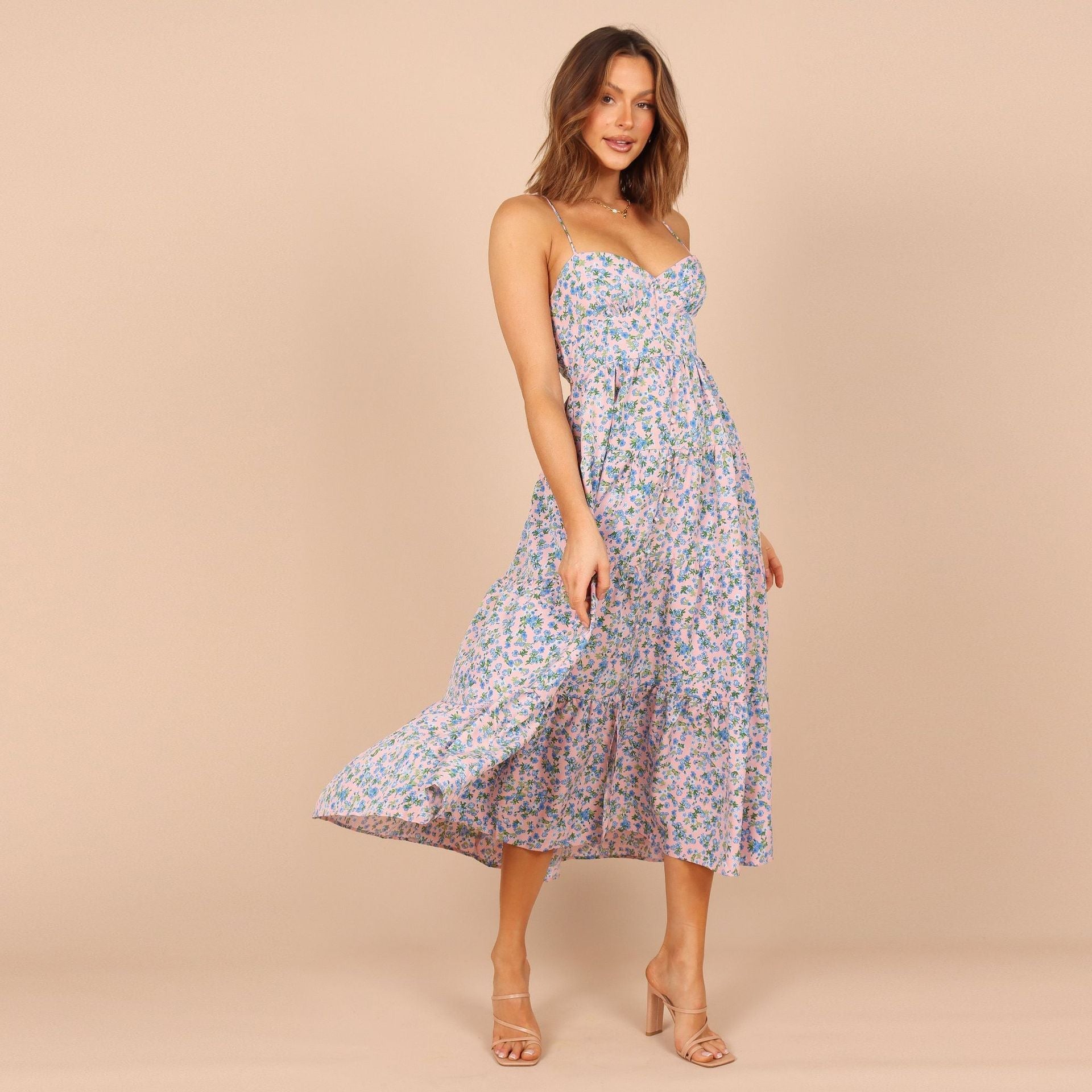 ////Best Selling Silhouette//New Print// Stroll around a resort in the Rio Floral Tie Back Midi Dress in blue. olive. yellow. beige. white. and lavender florals with a v-neckline.