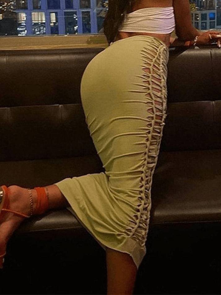 Style: Sexy. Street Color: Green Fabric Content: Polyester. Spandex Fit Type: Slim fit Length: Maxi Skirt Design: Ruched Cutout Detail Along Leg. Elasticated Waistband