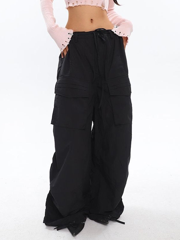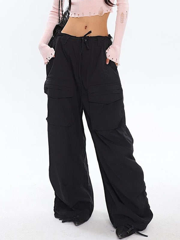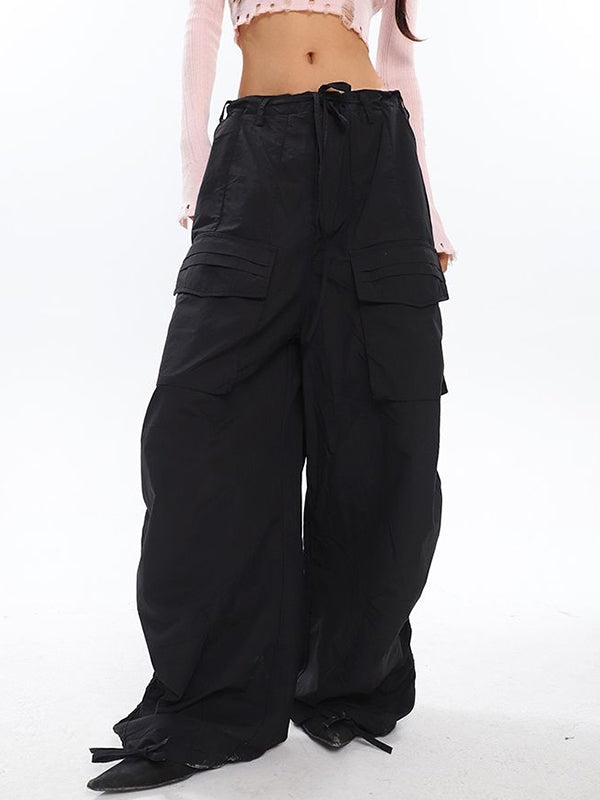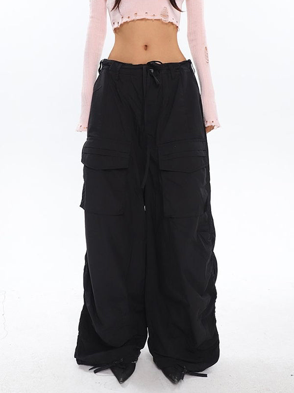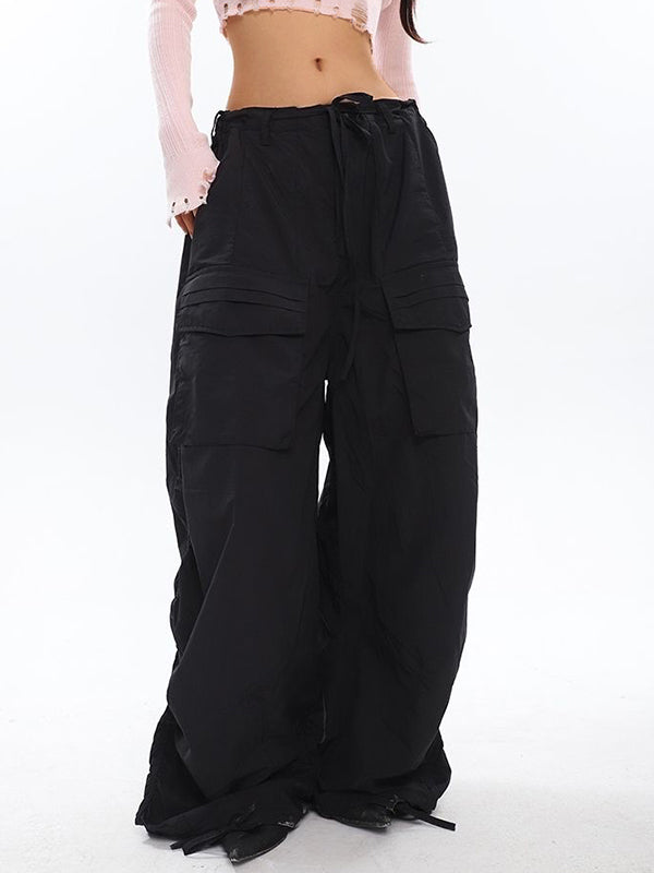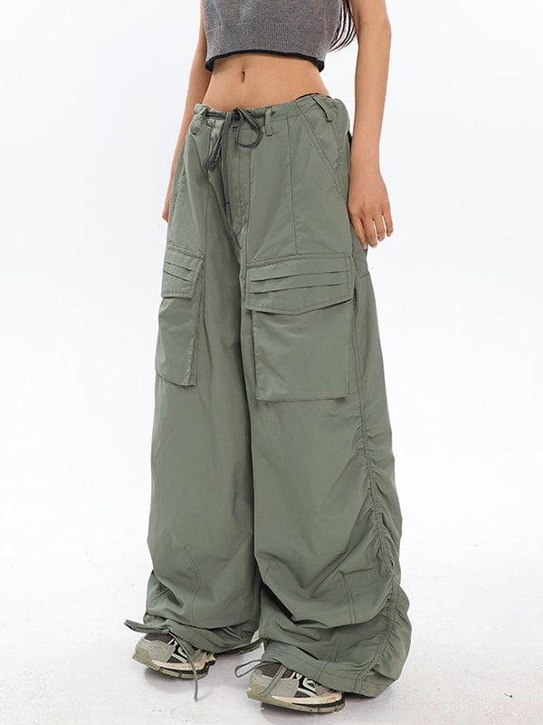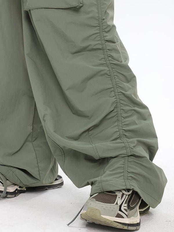 Description: These parachute-style pants are made from durable polyester fabric. shaped to a relaxed-leg silhouette. they have an adjustable tie waist style. features large cargo pockets detail on the front. with ruched leg design. drawstring tie on the cuffs. and fastened a button zip fly.